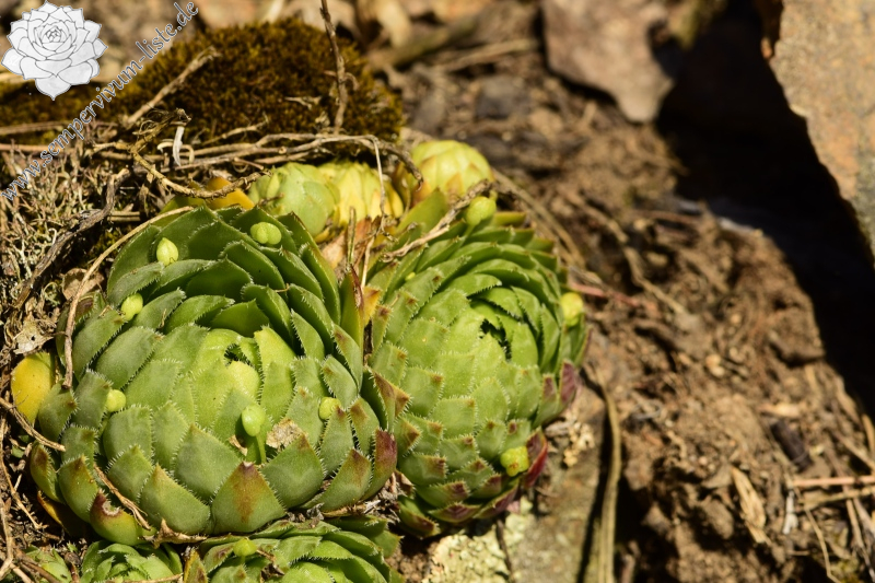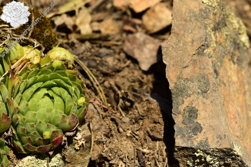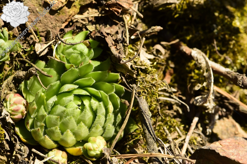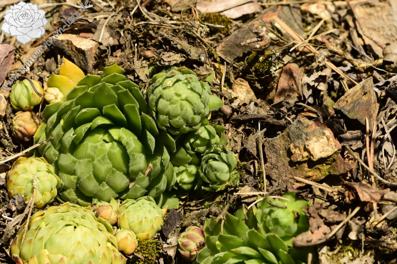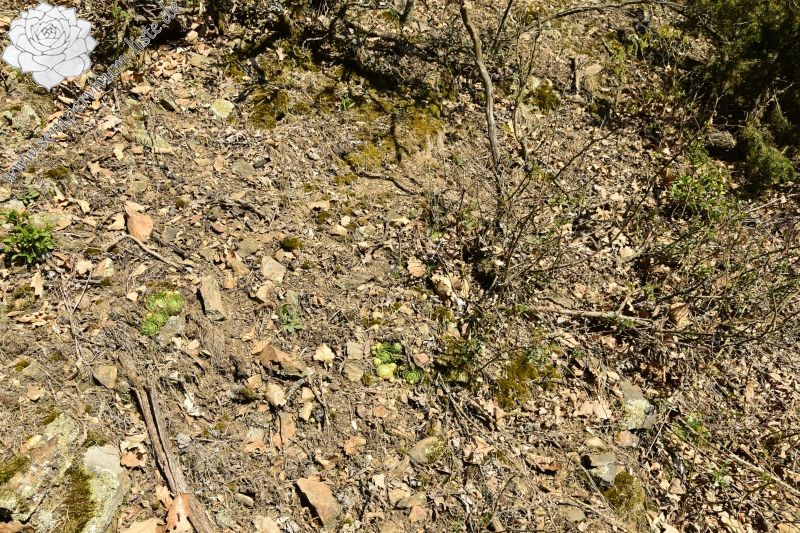 Auch diesen Naturstandort habe ich in den ersten Hälfte Frühlings besucht. Weil der Naturstandort teilweise durch die Bäume in der Umgebung beschattet wird, waren die Rosetten nur teilweise geschlossen und meistens hell grün oder frisch grün gefärbt. Am Naturstandort habe ich auch geschlossene Rosetten gesehen, die Rosettenblätter dieser Rosetten waren meistens grüngelb gefärbt. Nur einige Rosetten hatten dunkel rot oder rot gefärbte obere Dritel der äußeren Rosettenblätter. In der Zeit des Besuches haben viele Rosetten neuen Ausläufer gebildet, vertrocknete Blütenstengel habe ich am Naturstandort nicht gefunden. Es muss auch erwähnt werden, dass alle Rosetten am Naturstandort in dem guten Zustand waren.
