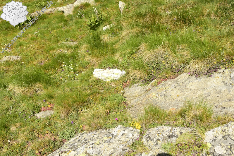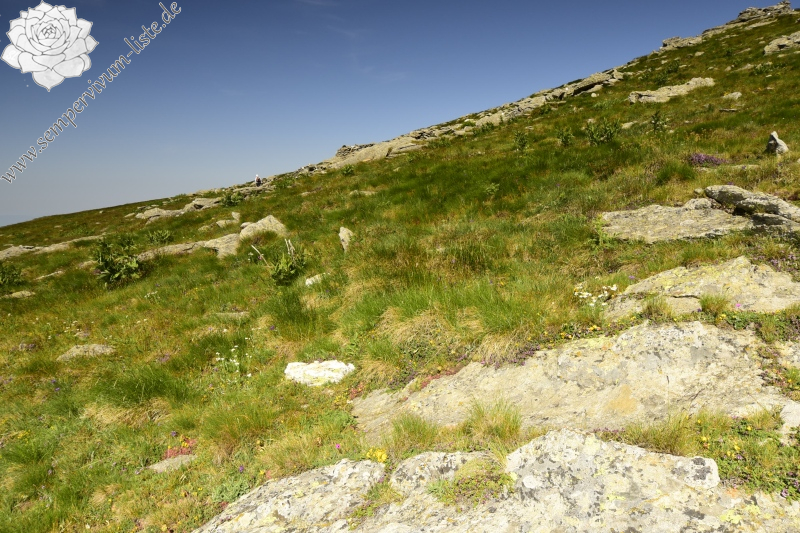 Die Berge sind im Sommer leer, das Skizentrum funktioniert nicht, die Skilifte fahren auch nicht, an den Abhängen der Berge weidet nur Vieh. Durch die Wiesen führen zalhreiche Wege, leider ohne Markierung für die Touristen, die Richtung ist aber klar, der Weg auf den Gipfel des Berges Kajmakčalan ist nicht kompliziert. Die Abhänge der Berge sind steil, aber nicht felsig, nur kleine Felsen oder Steinhaufen gibt es ab und zu an den Abhängen. Diese Örte sind für die Hauswurz geeignet. Wie ich schon in dem letzten Reisebericht erwähnt habe, befinden sich an den Abhängen des Gebirges Vórras die Naturstandorte von Sempervivum octopodes. In der Nähe der Endstation einer Seilbahn habe ich Sempervivum octopodes an einem wunderschönen Naturstandort beobachtet.