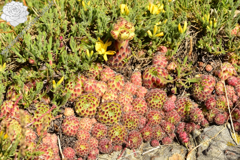 - 8. Juli 2019In den großen Kolonien habe ich ein paar Rosetten von Sempervivum octopodes kurz vor der Blüte gesehen
