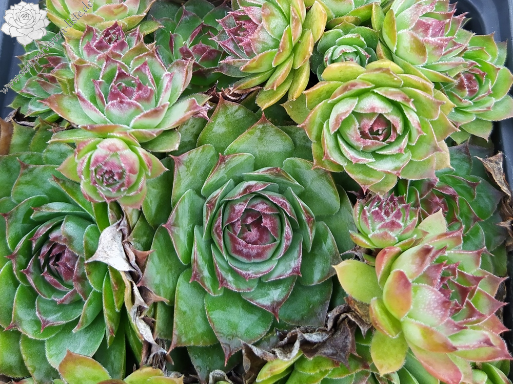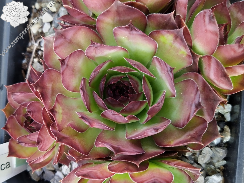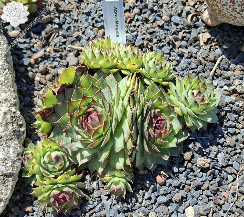 'Abra-Magica' hat kompakte, bis zu 6 cm groß werdende Rosetten mit glänzenden, rundlichen Blättern, die am Ende sehr schnell ganz spitz zulaufen. Über das gesamte Jahr ist die Hauptfarbe überwiegend grün. Nur die Farbe des Blattrandes verändert sich vom Frühjahr, wo er etwas breiter, in einem Gemisch von Braun und Gelb erscheint und zum Sommer hin schmaler wird und ein dunkles Braun annimmt. Mit zunehmender Sonneneinwirkung verblasst der Rand, so daß nur noch dunkle Spitzen zu sehen sind, die dann auch immer heller werden. Im Spätsommer erscheint die kompakte Mitte in einem leichten Lila.