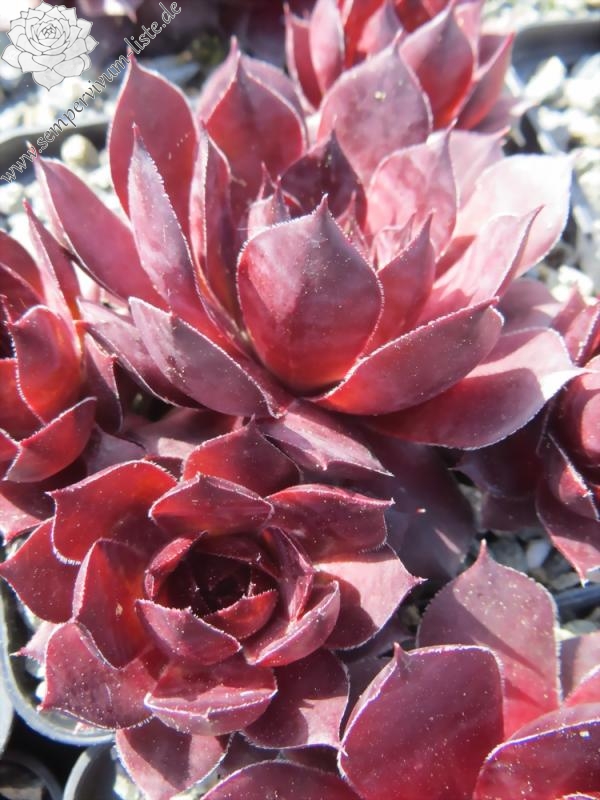 Rosetten bis 5 cm, Blätter oval, lang bespitzt, weinrot - purpurrot
