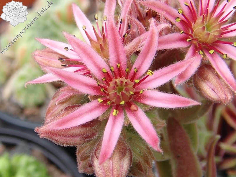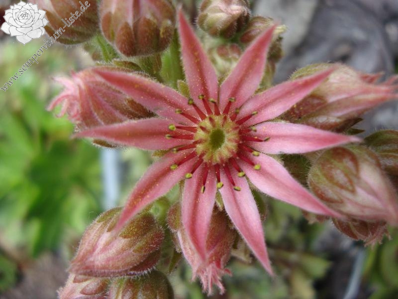 hellbraune Rosetten, ca. 5 cm Durchmesser, leicht silbrig übersponnen, robuste Sorte, Blüte rosa, 10 - 15 cm hoch