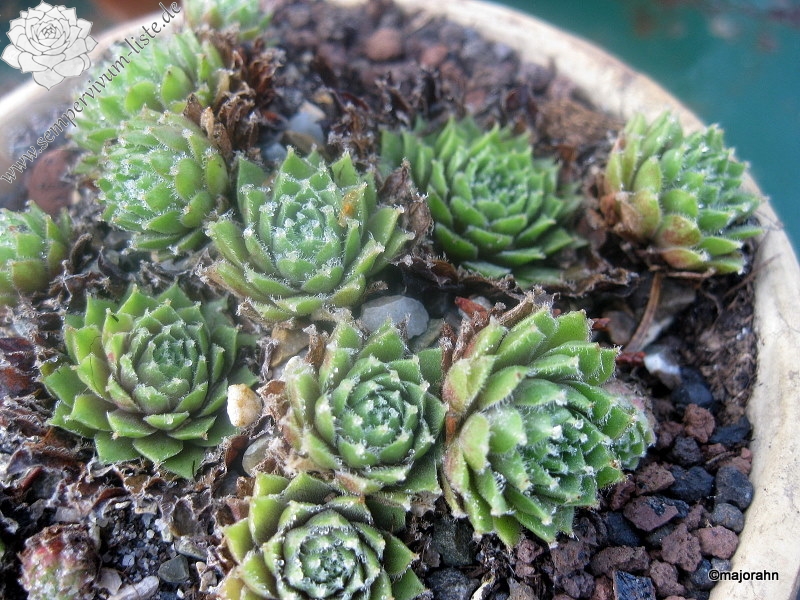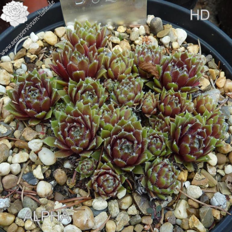 A cultivar that takes us back to the earliest days of hybridising Semps. Georg Arends (a famous Germany grower who bred and raised many garden plants) made the first recorded cross of two species to create the most appropriately named 'Alpha' (the first). That was in 1927, so getting on for 100 years ago. 'Alpha' is still being growing today which says much about its general garden worthiness. Gradually turns to pink in summer with silvery overtones from the tiny hairs. Small/medium in size.