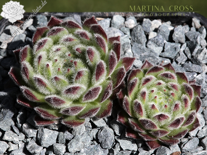 Die Pflanze ist ein Nachkomme aus einer Kreuzung eigener Hauswurz-Sämlinge, die wegen ihrer weißgelben Blütenfarbe ausgewählt und vermehrt wurden. Die Rosetten können einen Durchmesser von 6cm erreichen und sind gut wüchsig und sprossen willig. Im Frühjahr fällt die Pflanze besonders durch die sehr intensive Behaarung auf. Die Blütenstiele sind stark behaart und sind durch Ausscheidungen der Pflanze sehr klebrig. Die Blüte selbst ist auch eine auffallende Erscheinung. Ihre hellen Blütenblätter besitzen im Blüteninneren eine kräftig rote Farbe.