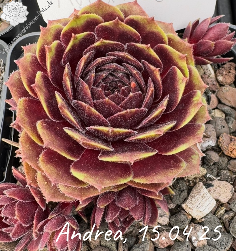Zufälligerweise erfuhr ich, dass einige Sammlerinnen mit dem Namen Andrea es bedauerten, ihren Namen nicht auch als Sempervivum in ihren Sammlungen zu haben, es gab ihn noch nicht. Dem konnte Abhilfe geschaffen werden und aufgrund seiner strahlenden Schönheit hatte er meiner Meinung nach einen ebensolchen Frauennamen verdient.