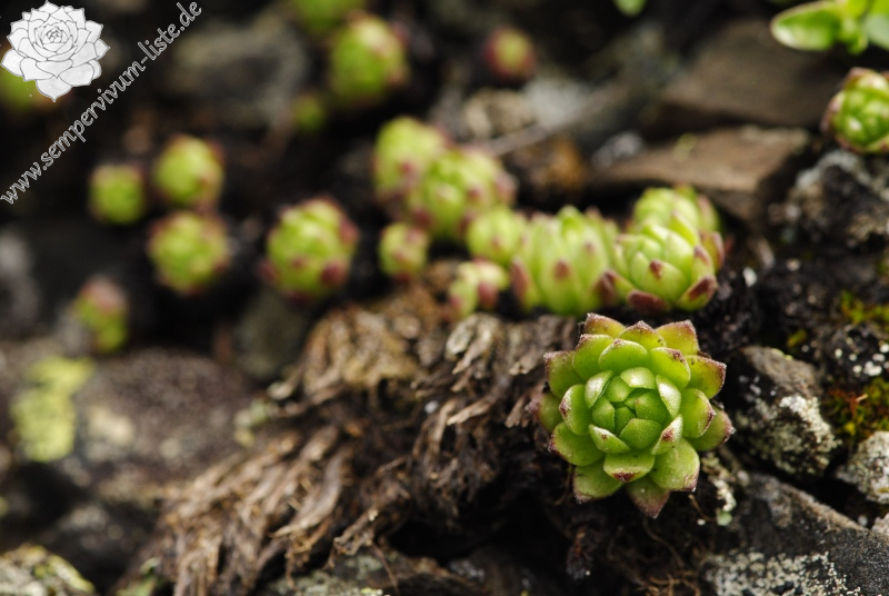 Obwohl die Rosetten an den Bildern fast typisch wie Sempervivum montanum ssp. montanum aussehen, sind diese Rosetten ein wenig durch die Kreuzung mit Sempervivum arachnoideum beeinflusst. Dafür sprechen nur einige Merkmale – vor allem die Größe der Rosetten und auch die Haare an den Spitzen der Rosettenblätter. Bei einige Rosetten sprechen für die Hybride auch die Wimpern an den Kanten der Rosettenblätter.