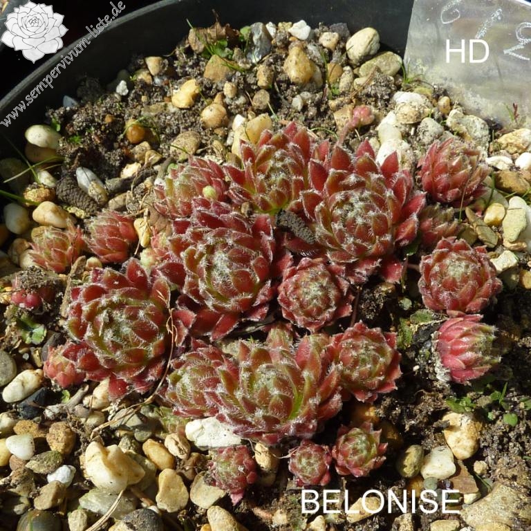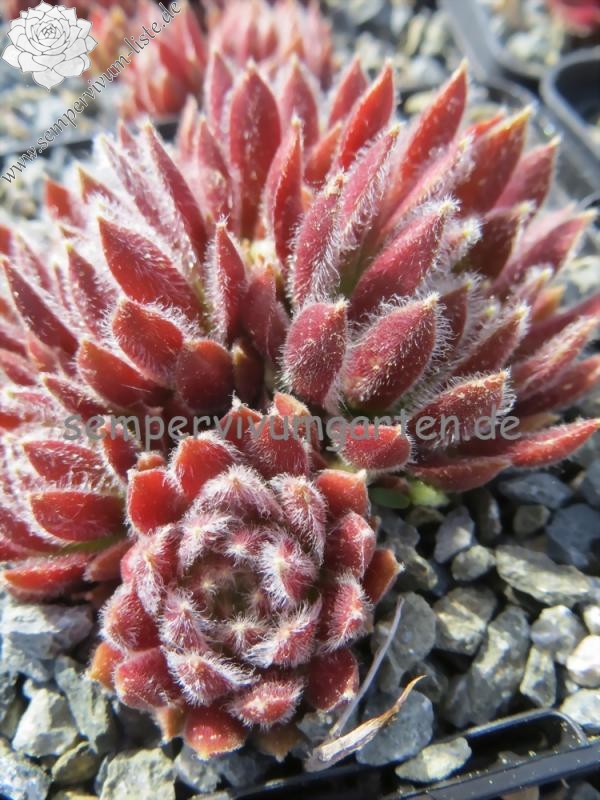 Eine schöne, sehr kühl wirkende Hauswurz. Die roten Rosetten erreichen einen Durchmesser von 5 cm und sprossen willig. Interessant ist die weiße Behaarung.