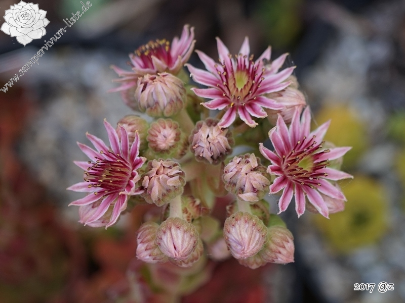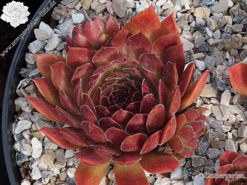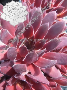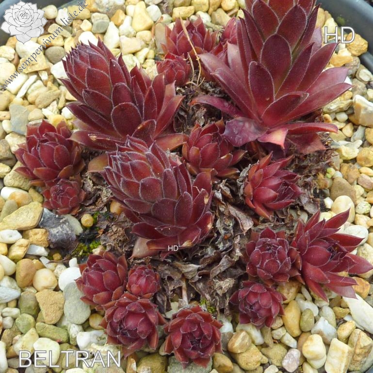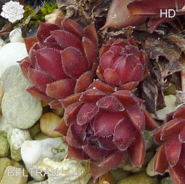 Sempervivum 'Beltran' ist eine neuere Züchtung aus Belgien, die mir sehr gut gefällt! Die größeren, roten Rosetten besitzen eine samtige Behaarung und wirken dadurch sehr kühl. Besonders im Frühsommer fallen die wüchsigen Pflanzen auf.