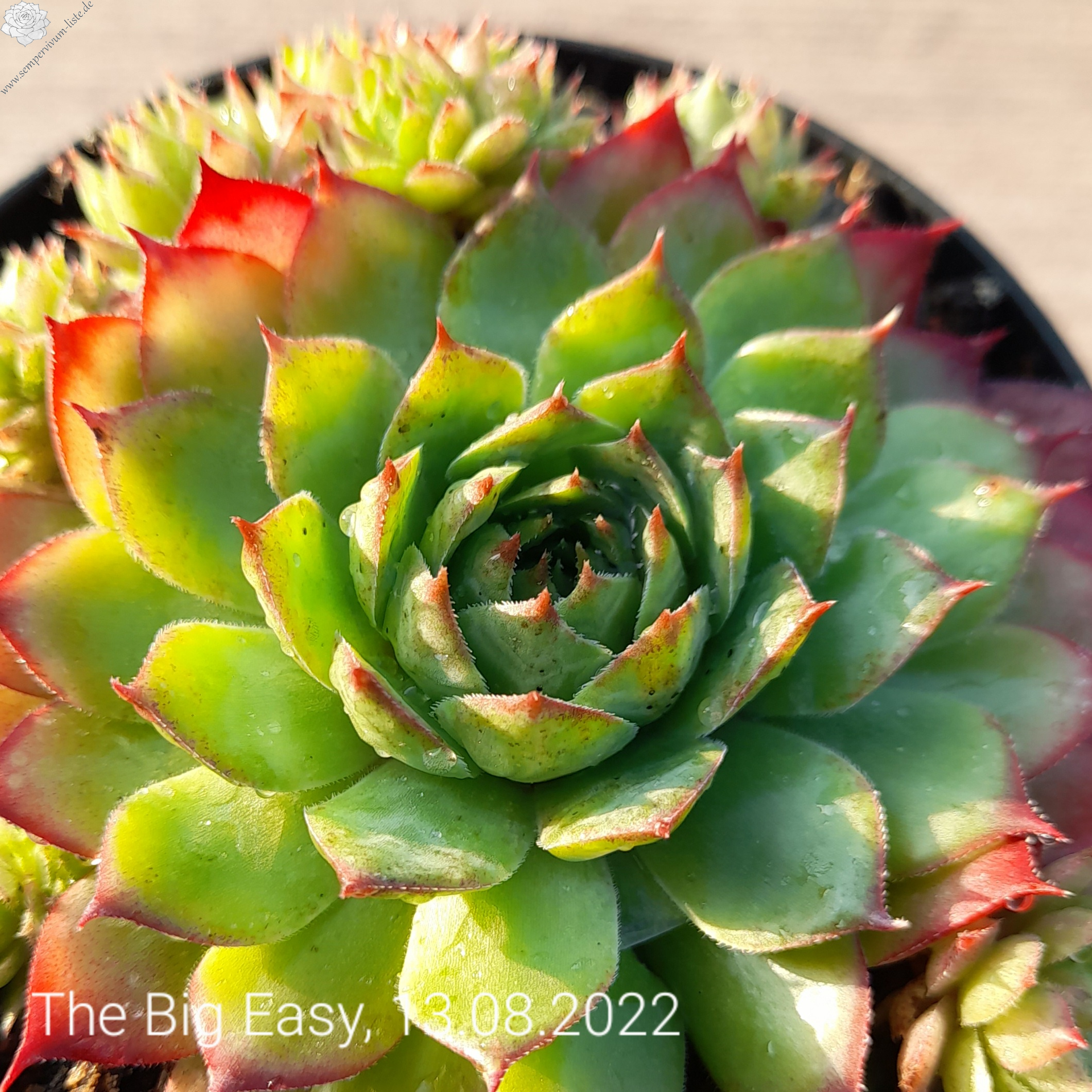 Nice vibrant green rosettes with bronze leaf margins and tips. Bronze fades somewhat with summer heat. Large. Don Mylin, 2021.