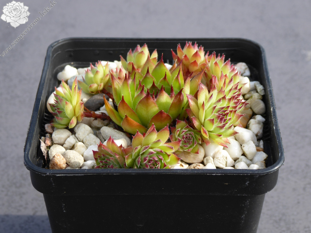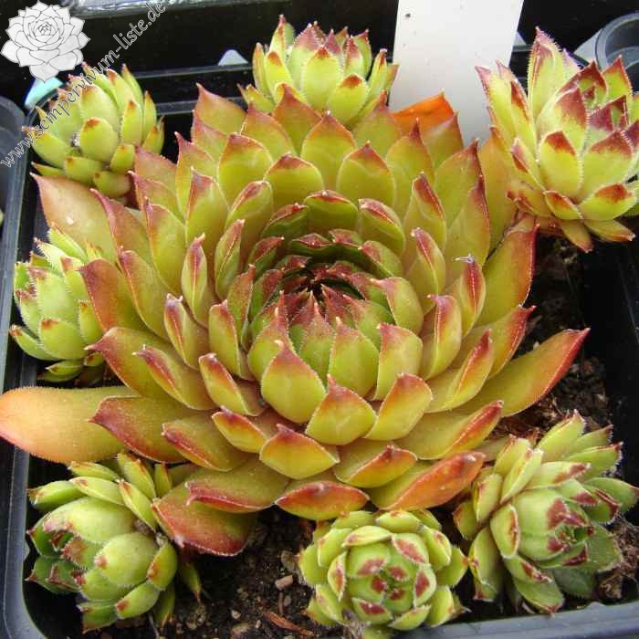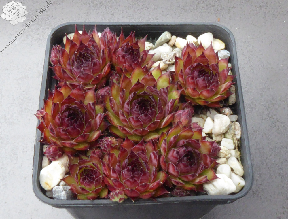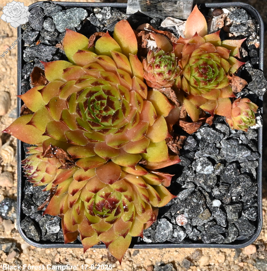 Mit dieser neuen mittelgroßen Selektion aus dem Schwarzwald haben wir es nicht etwa einem loderndes Flammenmeer zu tun, sondern man stelle sich eher eine gemütliches Lagerfeuer bei Dunkelheit vor, dass nach langer Brenndauer eine beruhigende Lagerfeuer Atmosphäre ausstrahlt. Betrachtet wir die Rosette mit seiner Kolorierung vom außen zum Zentrum genauer an. Die glänzenden, schmalen spitz zulaufenden Blätter zeigen im Frühling eine anfängliche warme orangegrüne Grundfärbung mit kleinen hellen rotbraunen Blattspitzen. Im fortschreitendem Jahresverlauf des Spätsommers verfärbt sich die vielblättrige Rosette vom Rand her immer dunkler. Das Zentrum bleibt letztendlich als heller glimmender Kontrastmittelpunkt erhalten, wie bei einem Lagerfeuer, bei dem die Flammen nach und nach sich reduzieren.