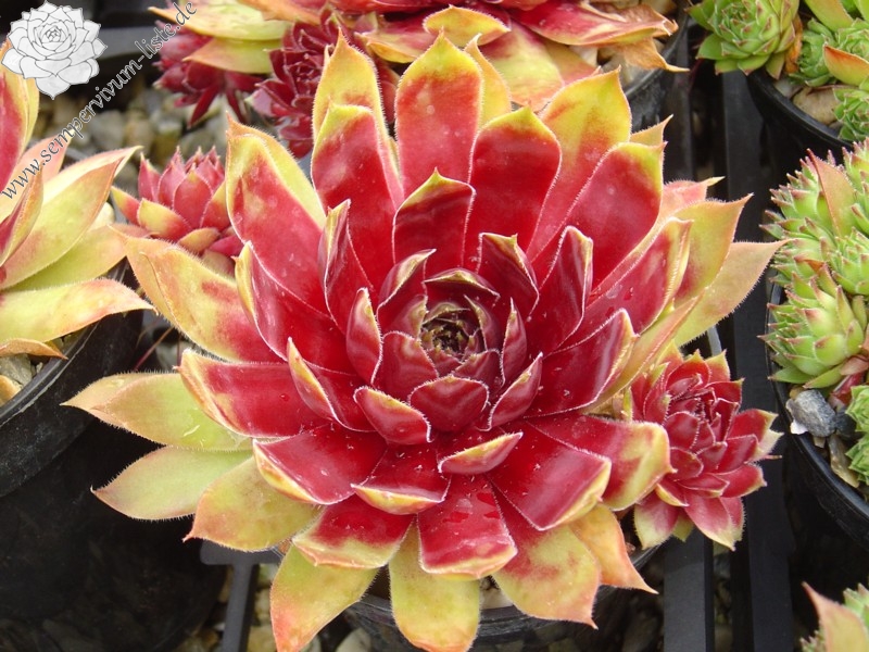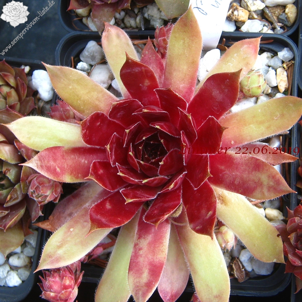 Sempervivum 'Blazen Jewel' besitzt auffallende Farben. Die großen Rosetten erreichen einen Durchmesser von über 9cm und sprossen gut. Besonders leuchtet das kräftig rosa gefärbte Zentrum im Mai/Juni. Eine wirklich schöne Pflanze.