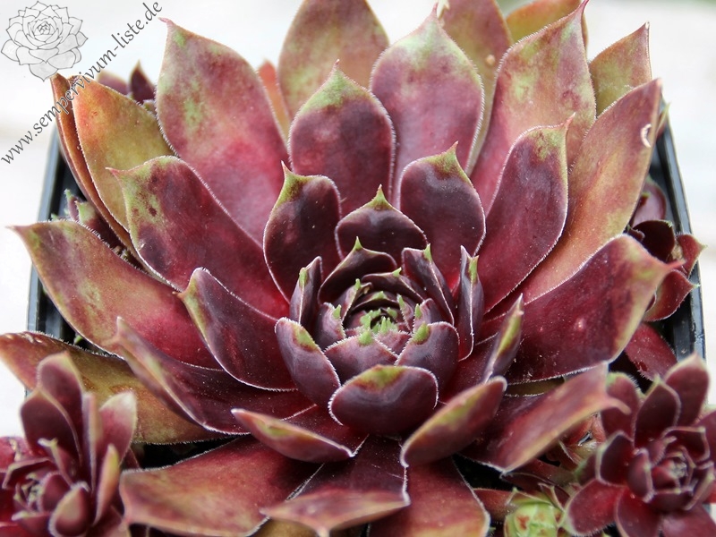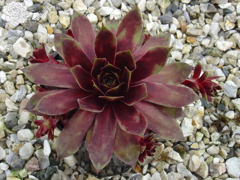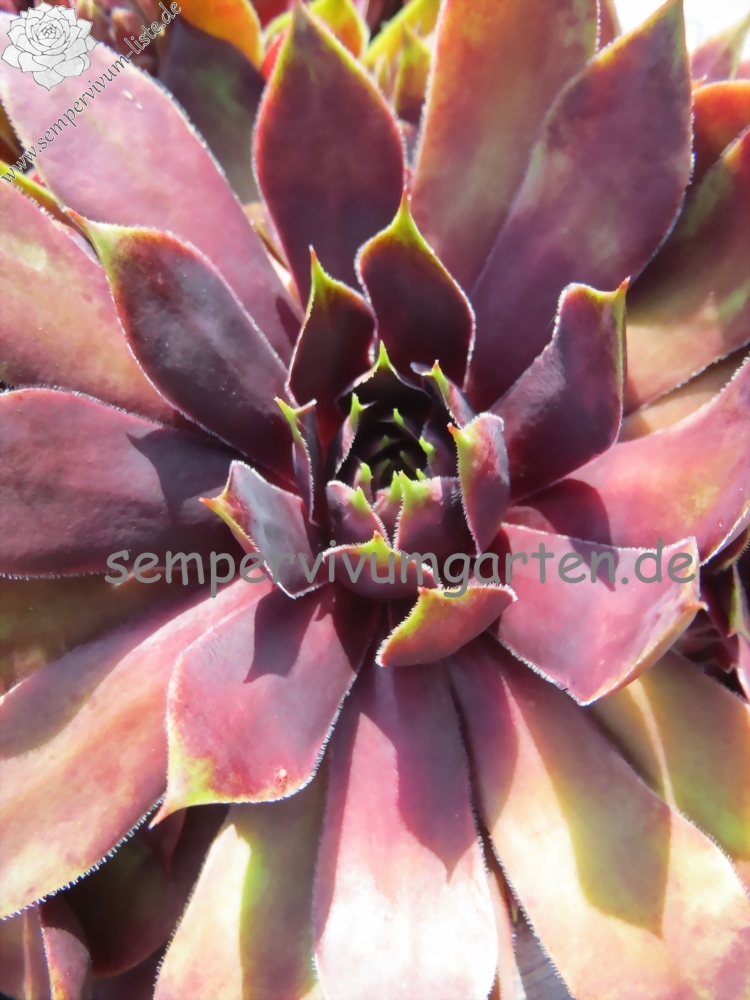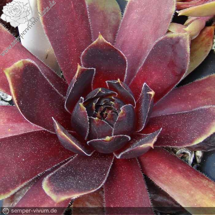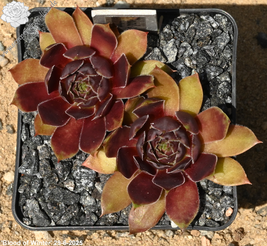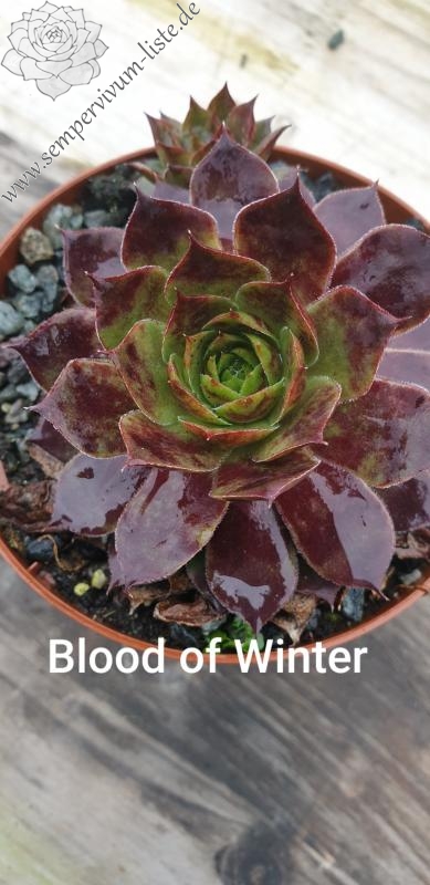 Sempervivum 'Blood of Winter' besitzt große, flache Rosetten. Im Zentrum bleibt die dunkle Farbe auch im Sommer sehr gut erhalten. Die äußeren Blätter werden im Sommer immer heller und zeigen fast beige Töne.