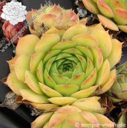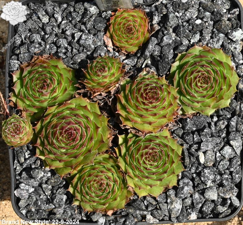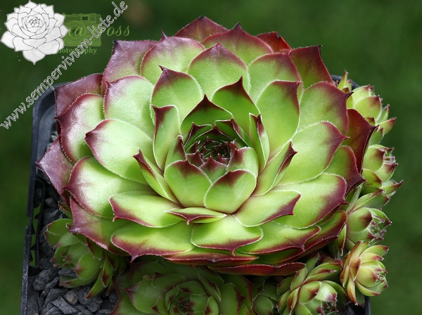 Eine neuere Züchtung mit etwas größeren Rosetten in brillanter Form. Die auffallend breiten und glänzenden Blätter sind während des Frühjahrs kontrastreich rotbraun bespitzt. Die Grundfärbung ist ein helles Grün das sich zum Herbst golden vermischt.