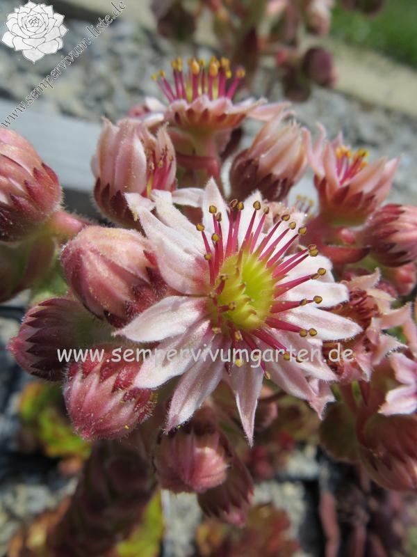 Ein kräftig wachsender Sämling von 'Honigmond'. Die wohl geformten frischgrünen Rosetten erreichen einen Durchmesser von 8cm. Besonders interessant sind die extrem breiten Blätter mit den dunkel gefärbten Blattenden, welche der Pflanze ein bulliges Erscheinungsbild verleihen. Die hellrosa Blüten, mit den rötlich gefärbten Staubfäden, präsentieren sich auf kräftigen Stielen. Es freut mich, dass in den letzten Jahren die Nachfrage nach grünen Sorten deutlich gestiegen ist.
