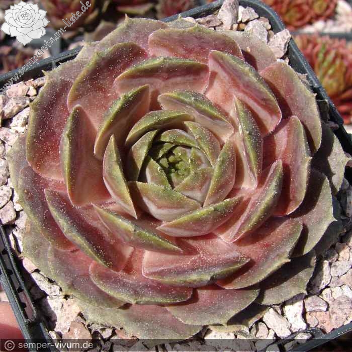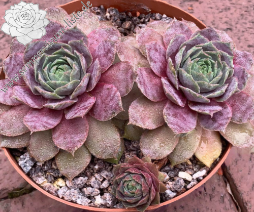 Unsere neue Auslese formt größere Rosetten mit einem Durchmesser von ca. 10 Zentimetern mit auffallend sukkulenten Blättern. Sie sind ganzjährig mit verschiedenen Rosatönen bemalt, zeitweise gemischt mit pastellfarbenem Olivgrün. Die Rosetten sind in der Regel sehr symmetrisch und somit von perfekter Form. Wir haben sie von Anfang an ins Herz geschlossen und vermehren sie jetzt seit acht Jahren. Insgesamt nicht ganz so wüchsig, das wiederum auch seine Vorteile mit sich bringt.