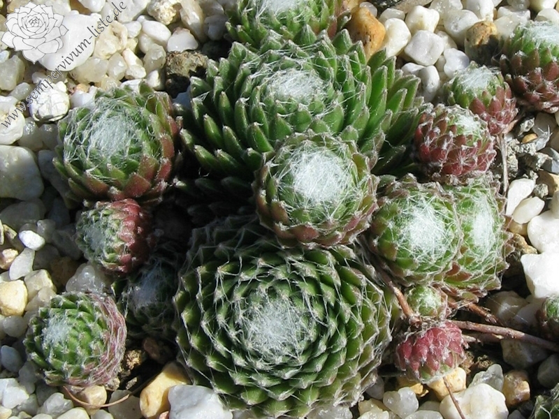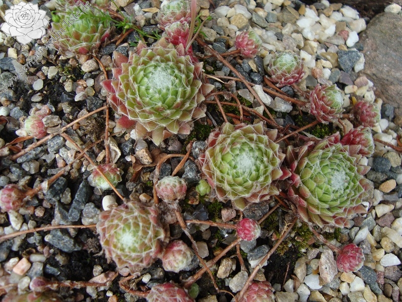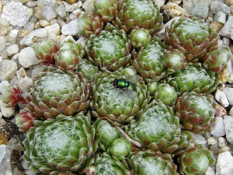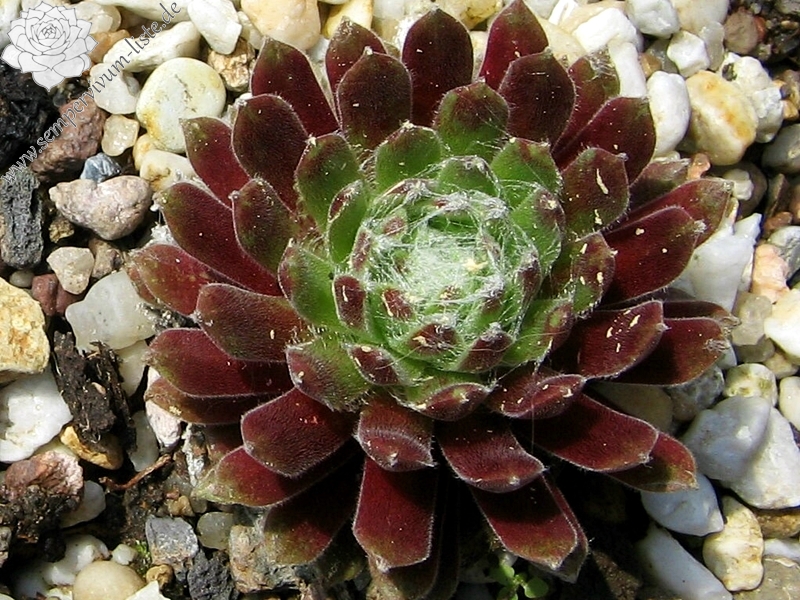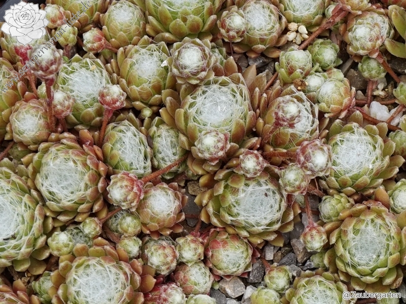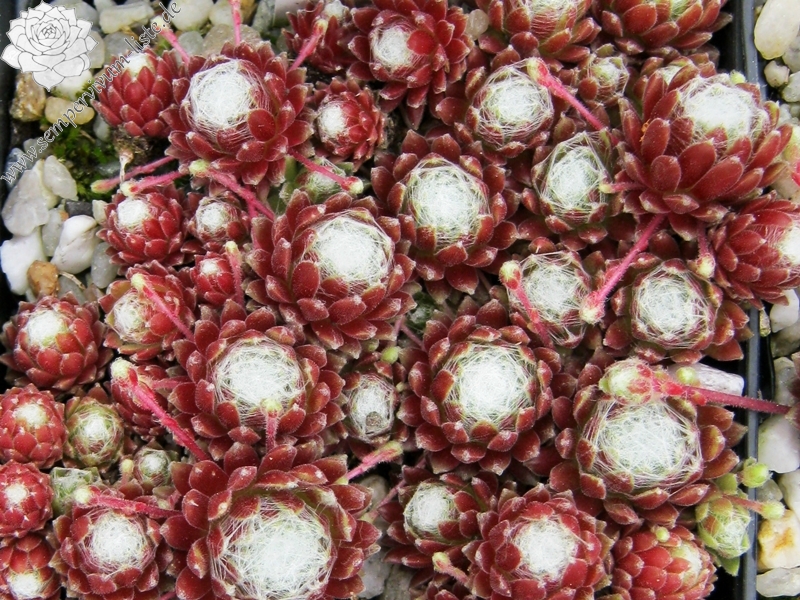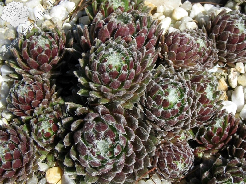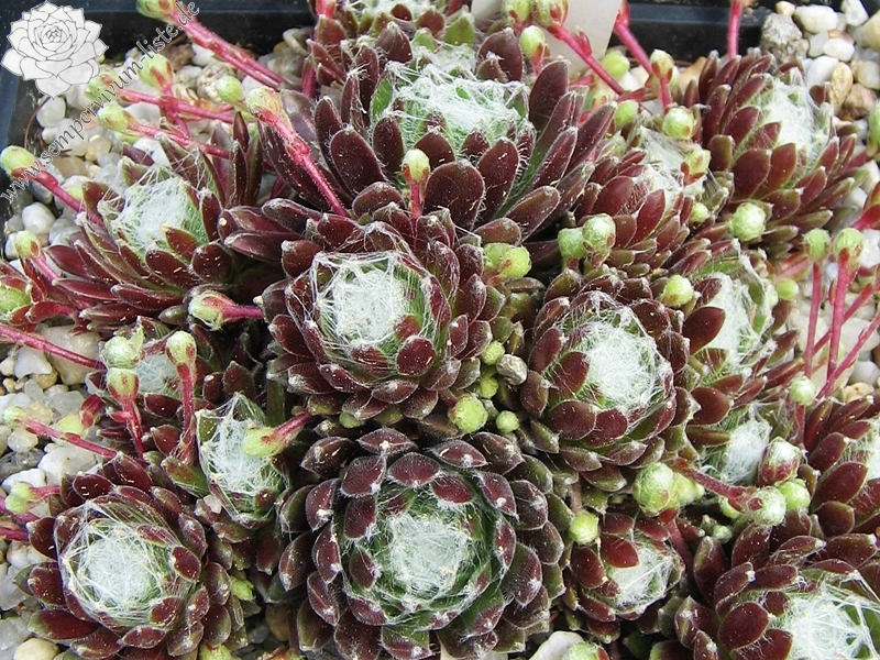 kleine braunrote Rosetten, innen grün, stark spinnwebartig behaart, Rosetten 3 cm