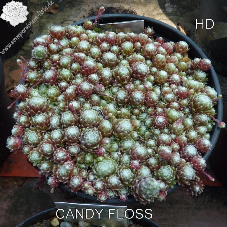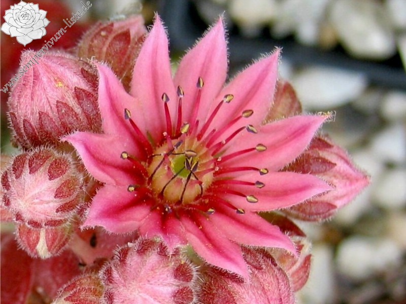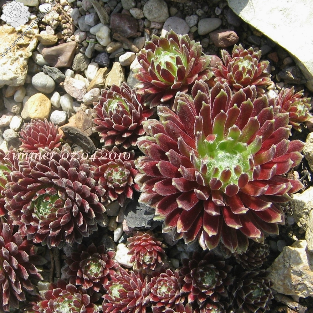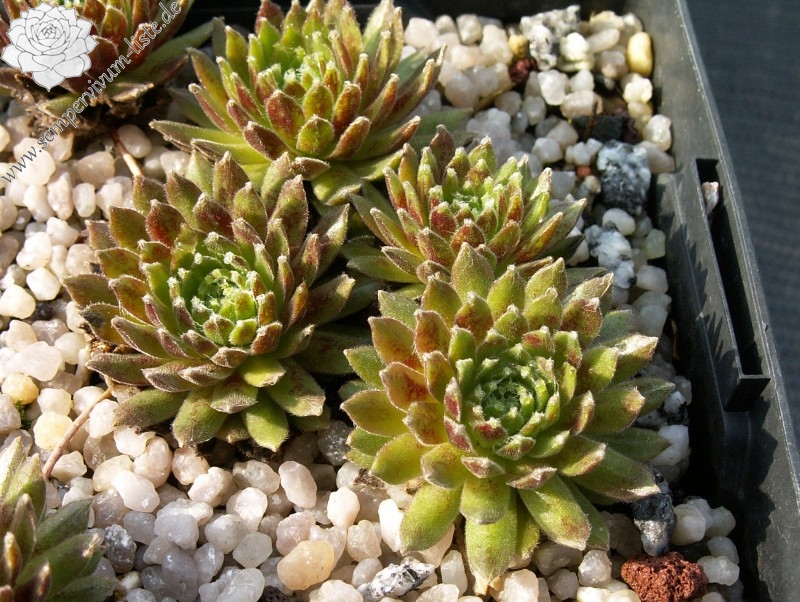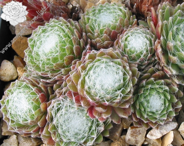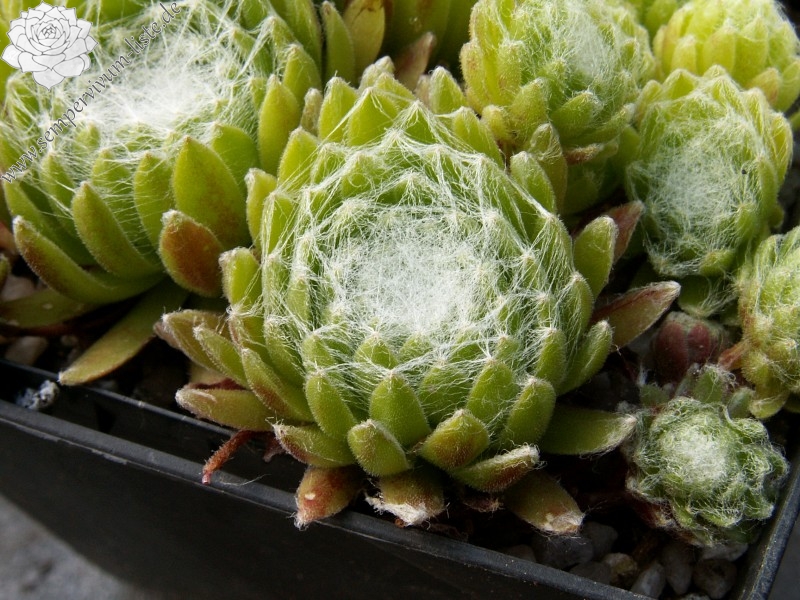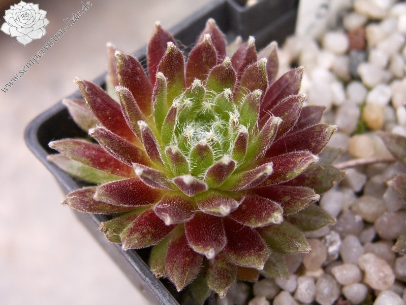 kleine braunrote Rosetten, innen grün, stark spinnwebartig behaart, Rosetten 3 cm