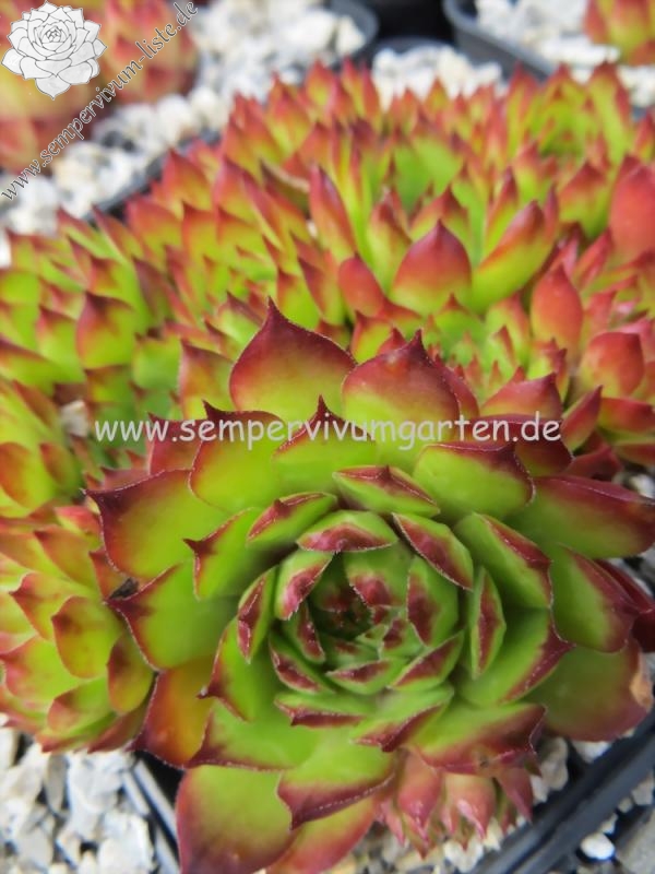 Hier haben wir eine kleine frischgrüne Sorte, die im Sommer leuchtend rote Spitzen zeigt. Die kleinen Rosetten bilden schnell sehr dichte Polster. Leider erscheinen die grünen Sorten zwischen den anderen farbigen Sorten fast schon etwas unauffällig. Hier täuscht jedoch der erste Eindruck. Bei dieser Sorte handelt es sich um eine sehr gute Züchtung, welche im Sortiment besonders im Sommer deutlich erstrahlt.