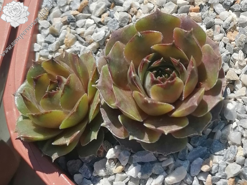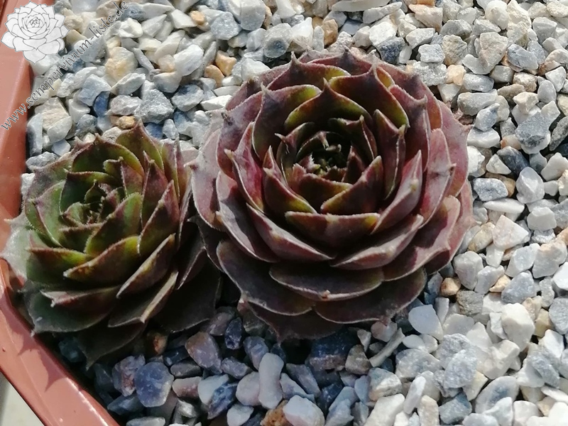 Die Mutterpflanze ist 'Rosenherz', die Aussaat erfolgte im Jahr 2020. (Der Name dieser Pflanze. es ist absichtlich mit „C” geschrieben.) Durchmesser der Rosetten beträgt ca. 5-6 cm, sind ziemlich kompakt, bei nährstoffreicherem Substrat werden die Pflanzen viel größer und die Blätter werden länglicher. Diese sind breit, verlaufen spitz, am Blattrand befinden sich winzig kleine zarte Wimpern. Die Färbung variiert zwischen Beige, Senf grün, Pastell Farben und zarte lila, rosa tönen. An den Blattspitzen ist sie rötlich braun, im Sommer zeigt sie ihren tollen Marmorierung mit weißen Streifen. Sobald das Wetter kühler wird, verwandeln sich die Farben in grünliche Tönen. Kindelt mäßig bis gut. Die Kindel sitzen ziemlich knapp an kurzen Stolonen neben der Mutterpflanze.