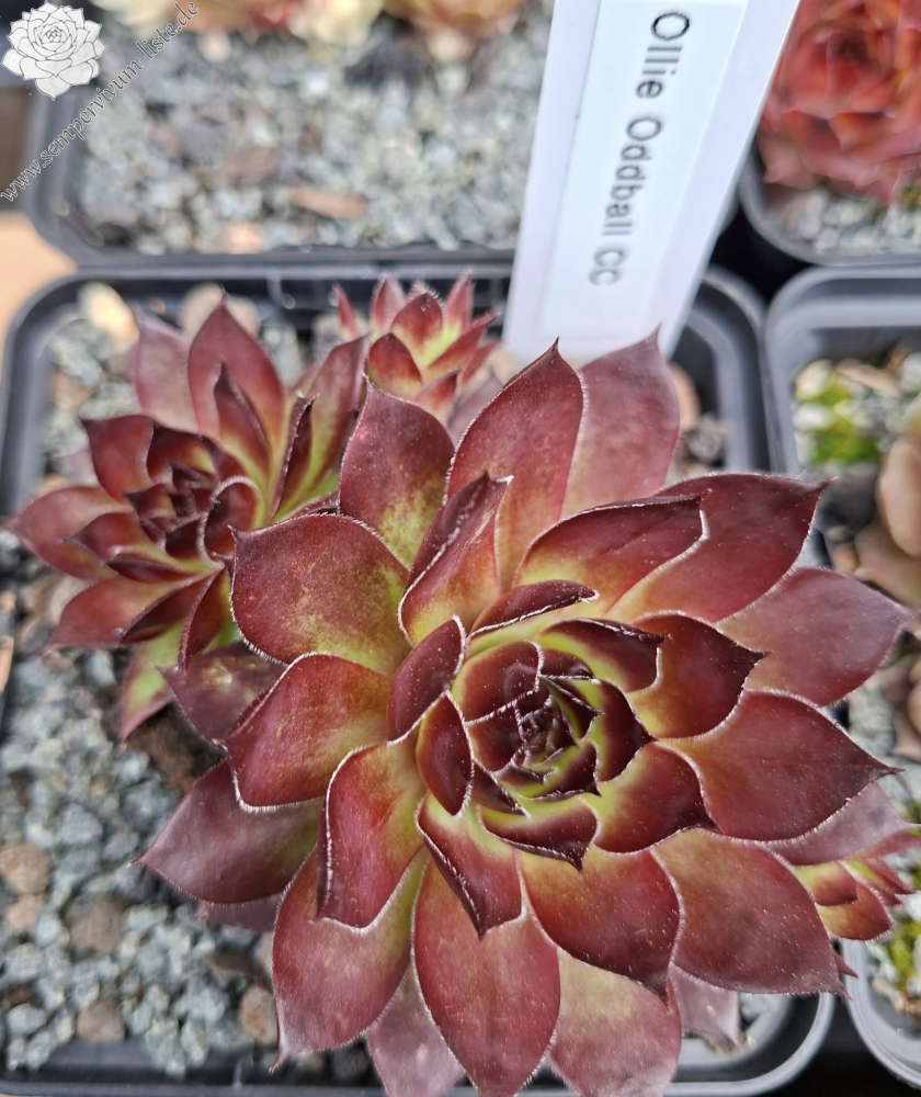 The Chick Charmlettes series of miniature Hen & Chicks are every bit as colorful, vigorous, and cold hardy as their larger flock members, just smaller! These little Chicks were selected to remain small and work great in tight places. Sempervivum Chick Charmlettes 'Ollie Oddball' has broad, emerald green leaves edged with burgundy. PPAF
