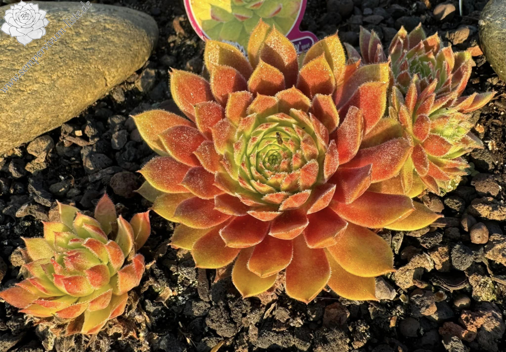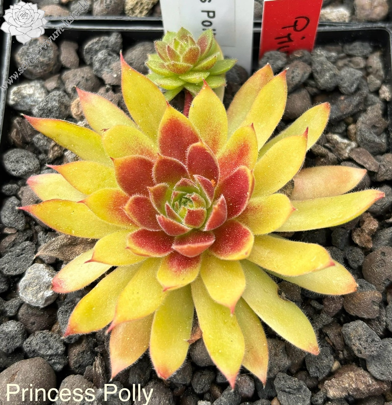 Die leuchtend gelben Rosetten von Sempervivum Chick Charmlettes „Princess Polly“ zeigen je nach Jahreszeit eine rubinrote Mitte oder rote Blattspitzen. PPAF