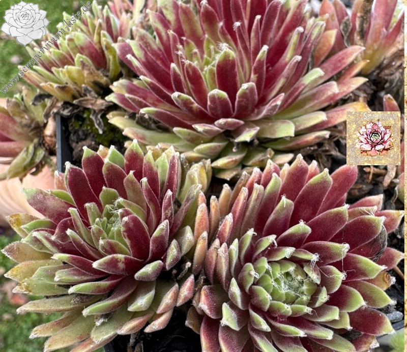 Sempervivum Chick Charmlettes „Sleepy Steve“ bildet tiefrote Rosetten mit weißem Geflecht in der Mitte. PPAF
