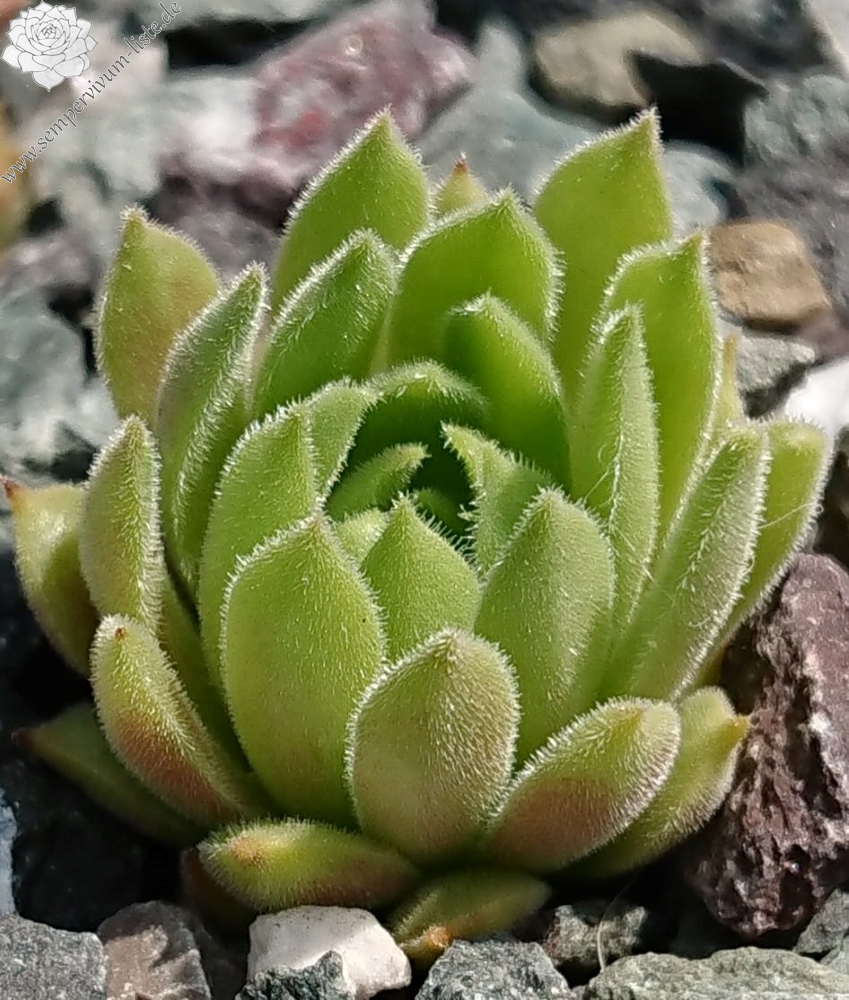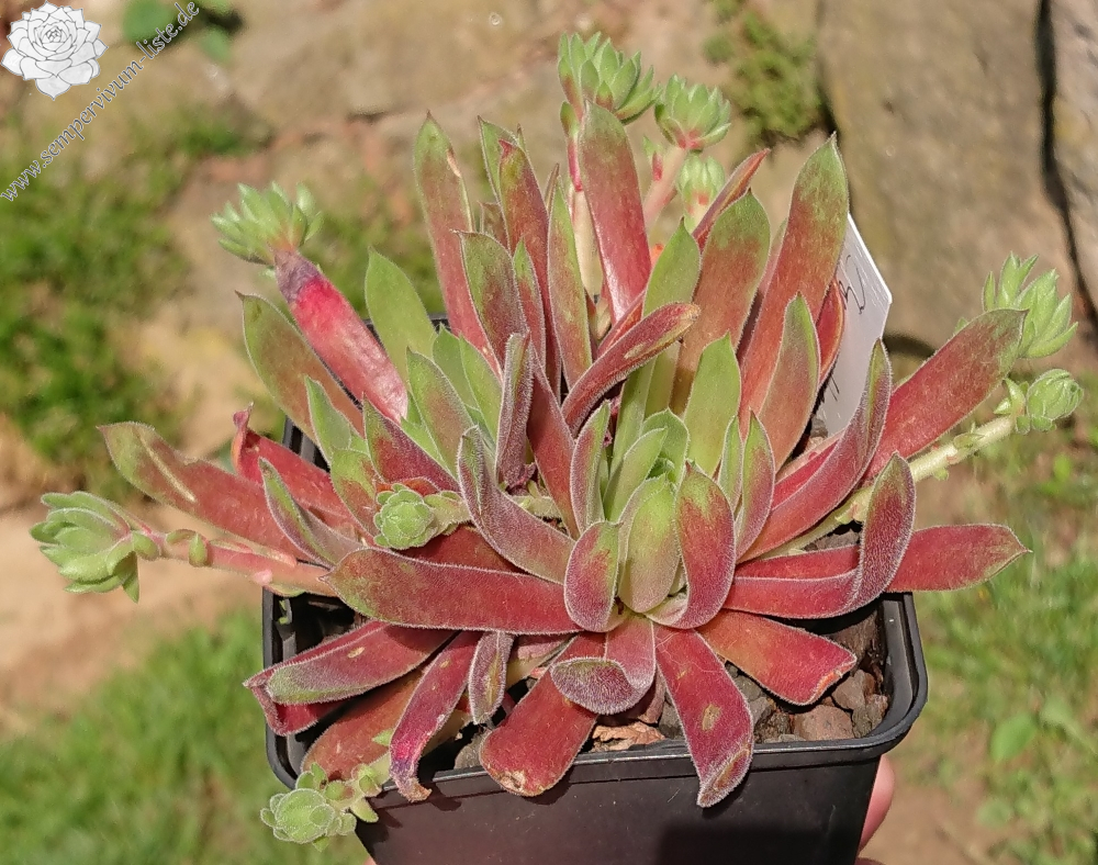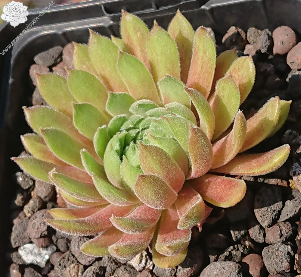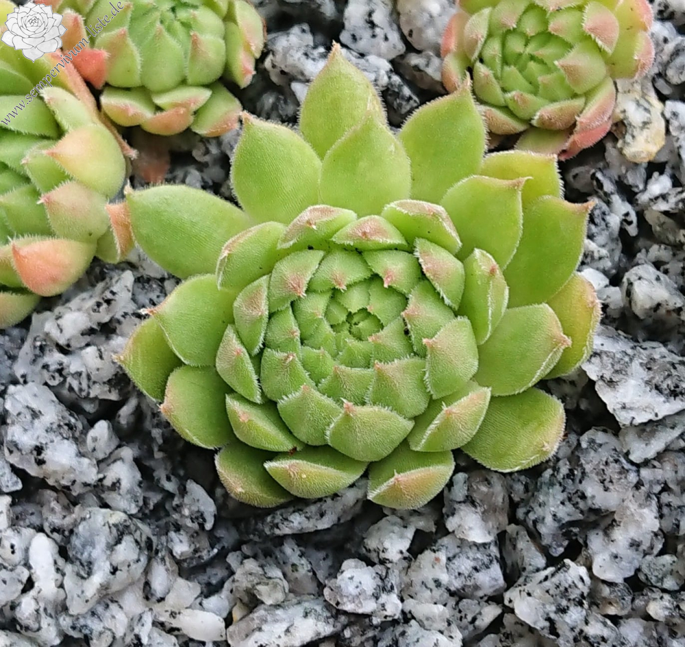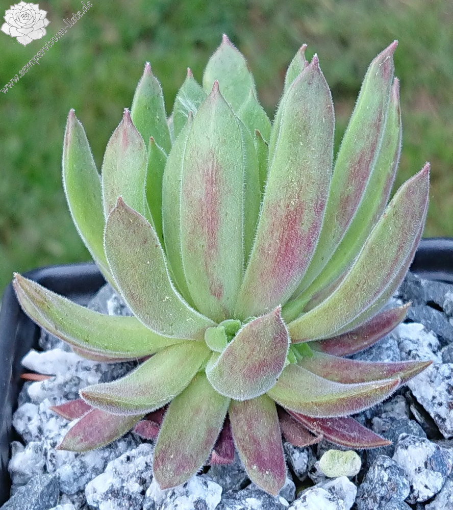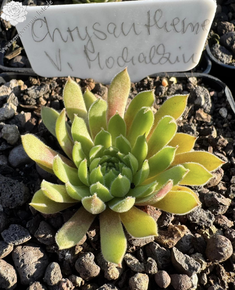 Im Frühjahr und Sommer zeichnen sich die Rosetten durch ihre schönen, steil nach oben gerichteten Blättern aus. Die samtigen, langen Blätter sind 1 cm breit und haben eine linealische Form, die steil nach oben zeigt. Anfangs zeigen die hellgrünen Blätter im Frühling leichte rote Töne, die im Sommer intensiver werden. Immer grün leuchtet das Herz der Rosetten. Die Blätter weisen unterschiedlich ausgeprägte Dornen auf, die manchmal sogar in Richtung des Herzens gebogen sein können. Im Spätherbst wird die 'Chrysantheme', wie viele andere Sorten grün und überwintert dann als kleine, samtige, flache Rosette. Diese Sorte wächst gut und verträgt lange Hitze sowie längeren Regen ohne Probleme.