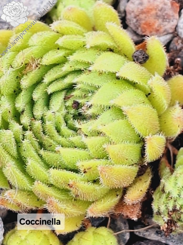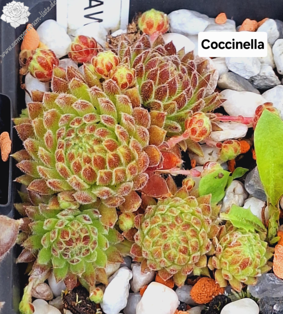 COCCINELLA (Biedronka) siewka z 2021/23 (rok premiery 2023) matka 'Special Gift'. Drobniutkie rozety rosną w skupieniu, tworząc jakby pancerz. Ubarwienie zmienne, wczesną wiosną środek rozet jest czerwony, potem odwrotnie, środek jest zielony a zewnętrzne liście czerwone, latem kolory bledną.