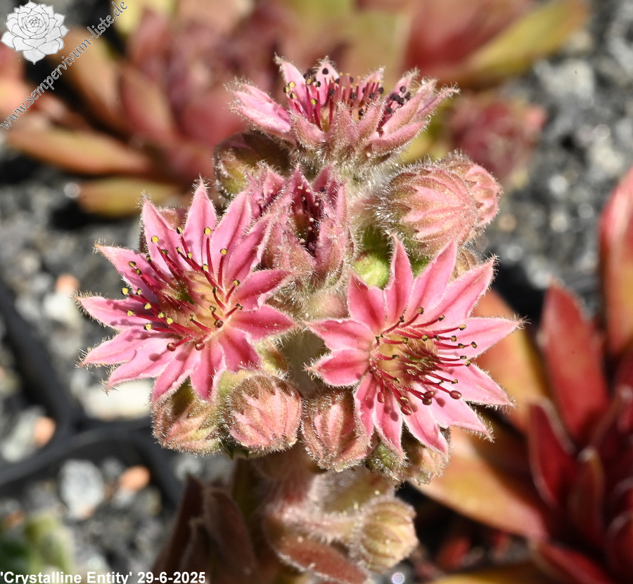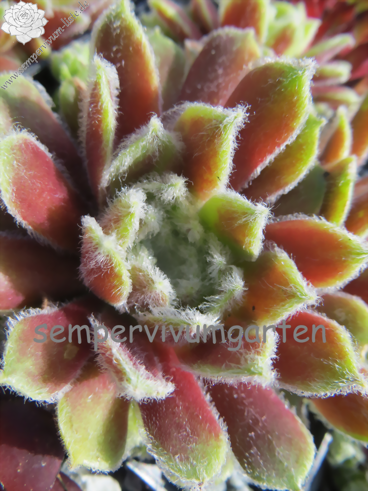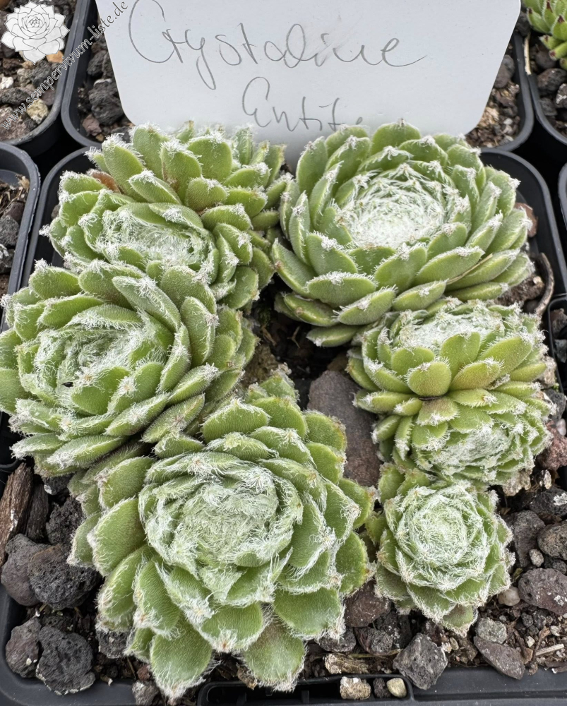 Sempervivum 'Crystalline Entity' fällt besonders durch die weiße Behaarung auf. Die mittelgroßen Rosetten bilden dichte Polster. Eine wüchsige Pflanze.