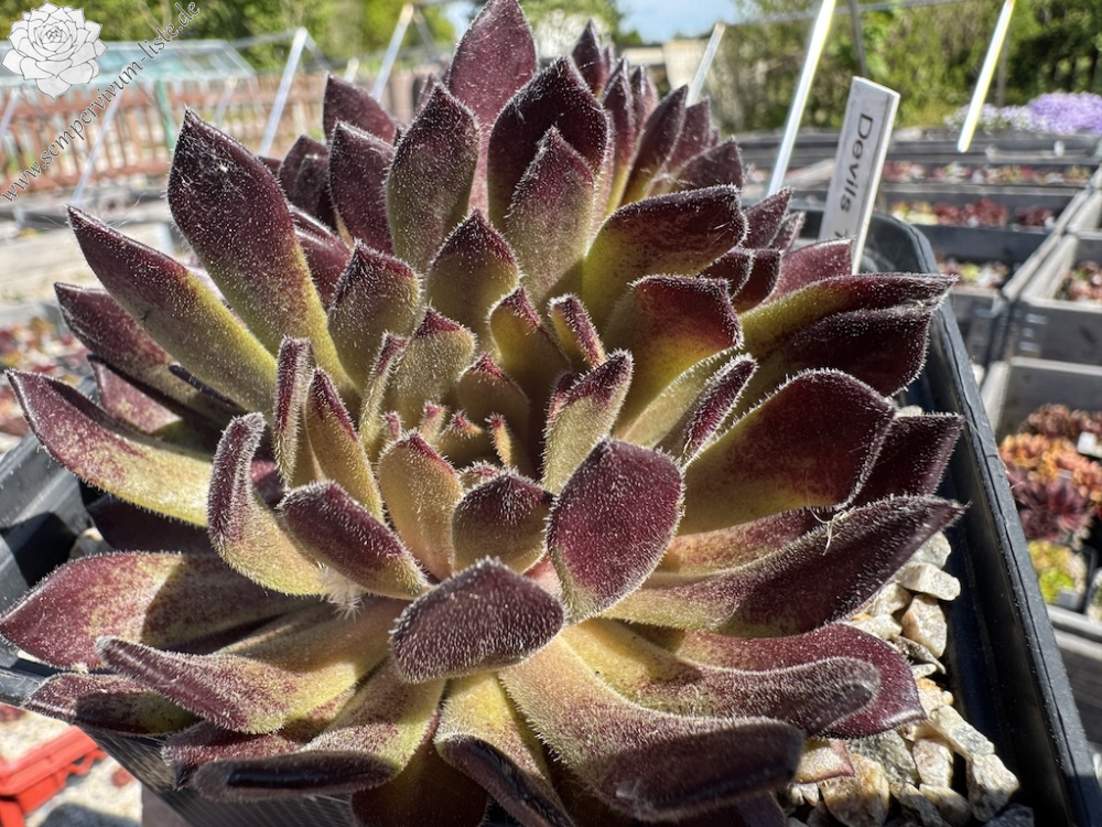 Im Juni verwandet sich die Farbe der äußeren, samtigen Blätter in ein tiefes Rot. Die mittleren Blattreihen strahlen in hellem beige und die Spitzen werden ebenfalls tiefrot. Im Sonnenlicht scheinen die Blätter goldgelb. Das helle Rosettenherz ist fest geschlossen und die Blättchen zeigen einen roten Dorn.