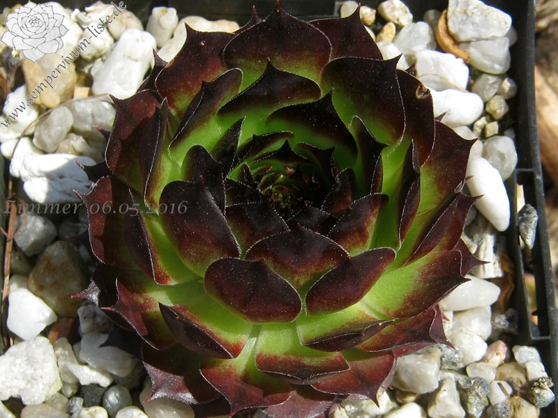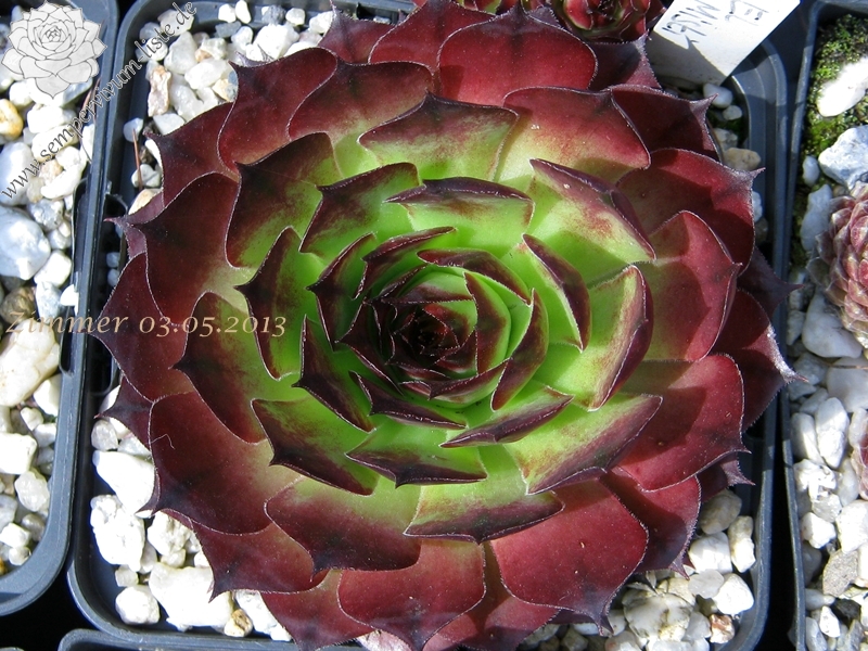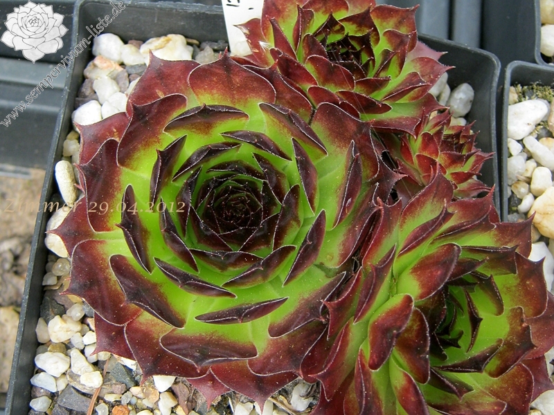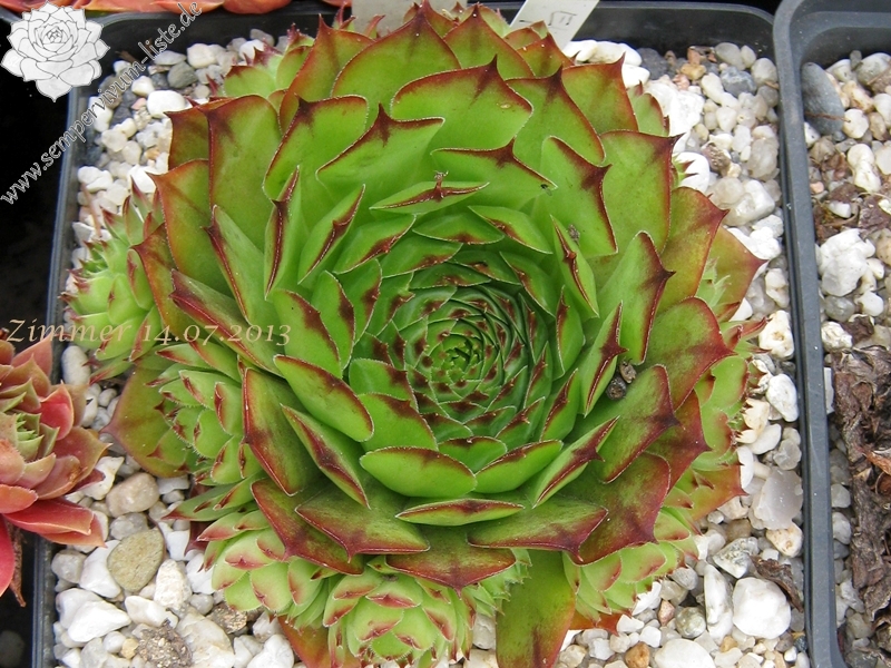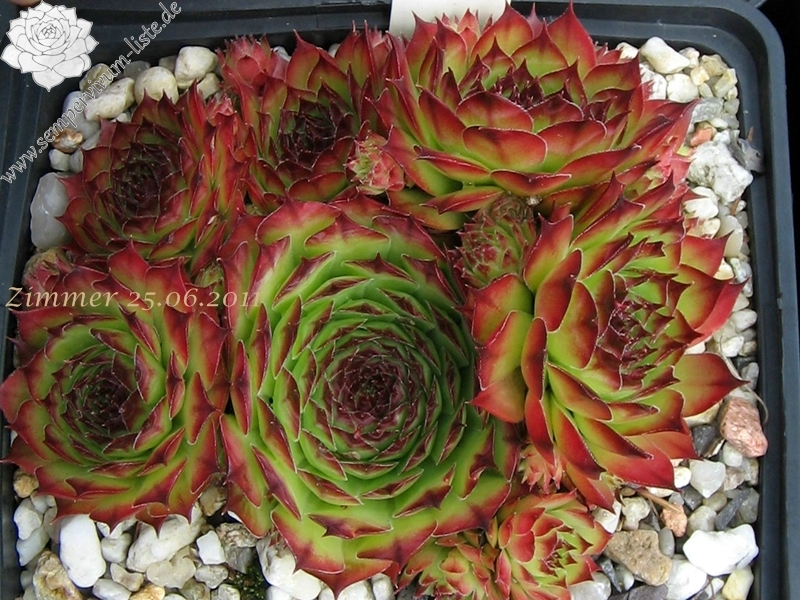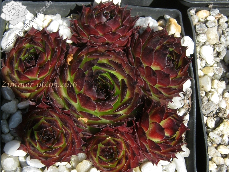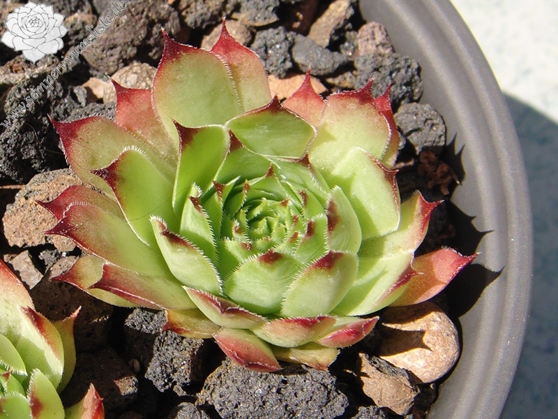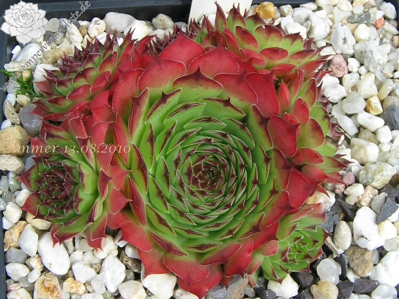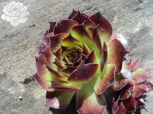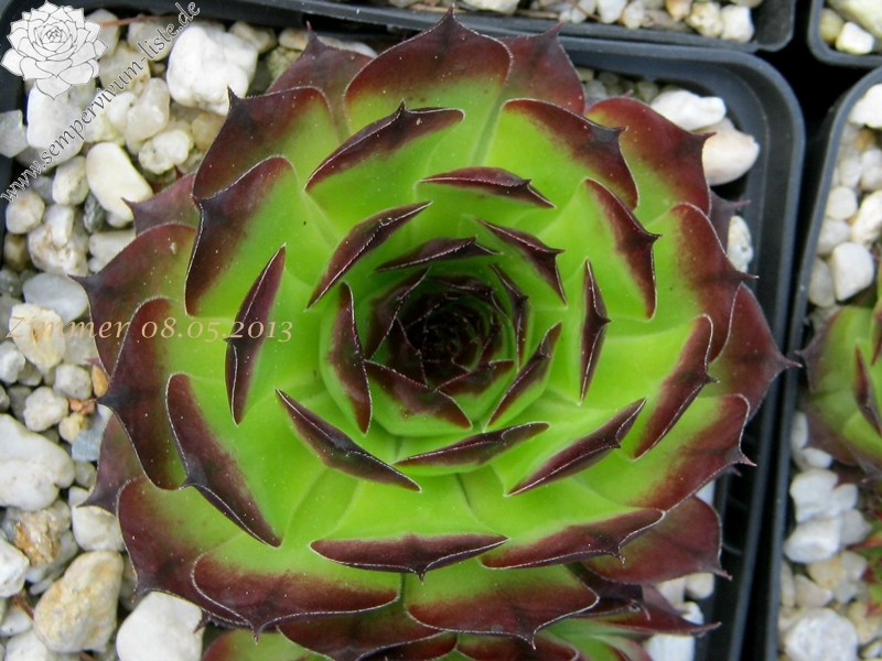 Rosettendurchmesser 5 cm, breit und flach, dunkelgrün, braunrote Spitzen.