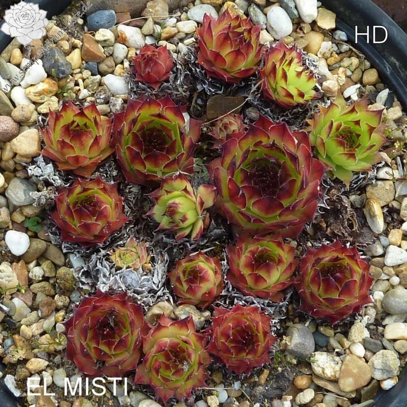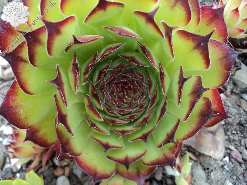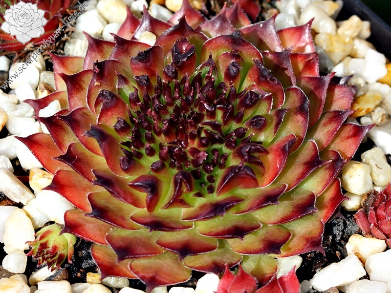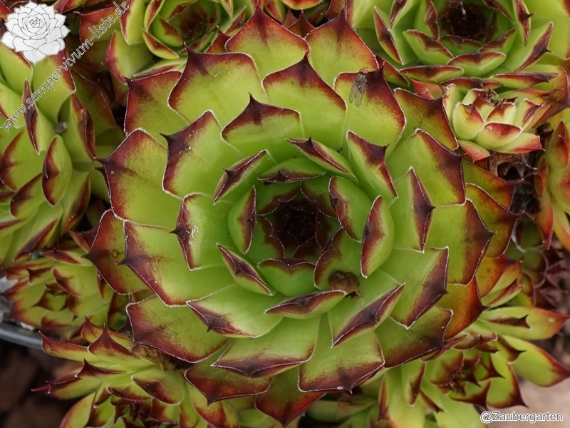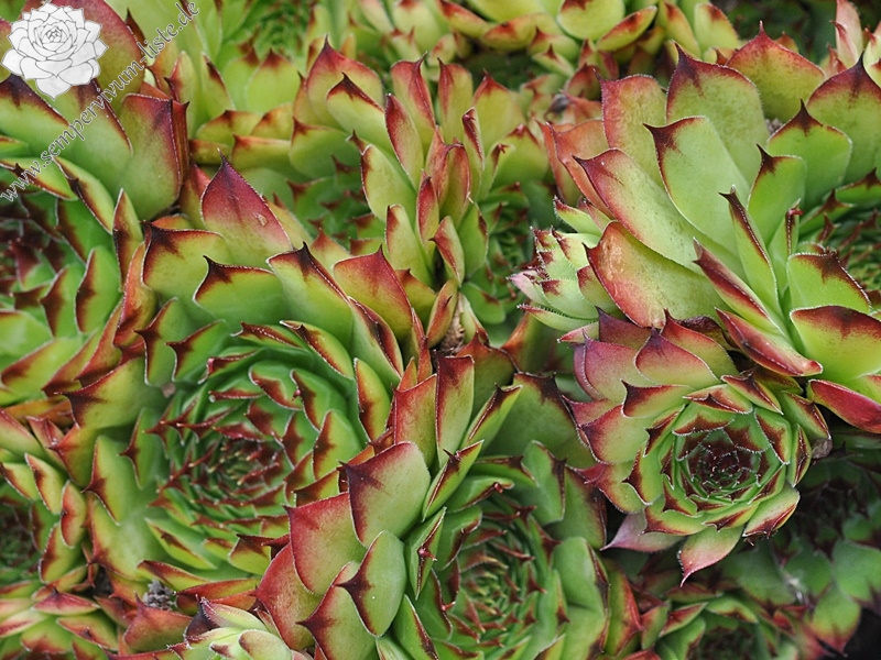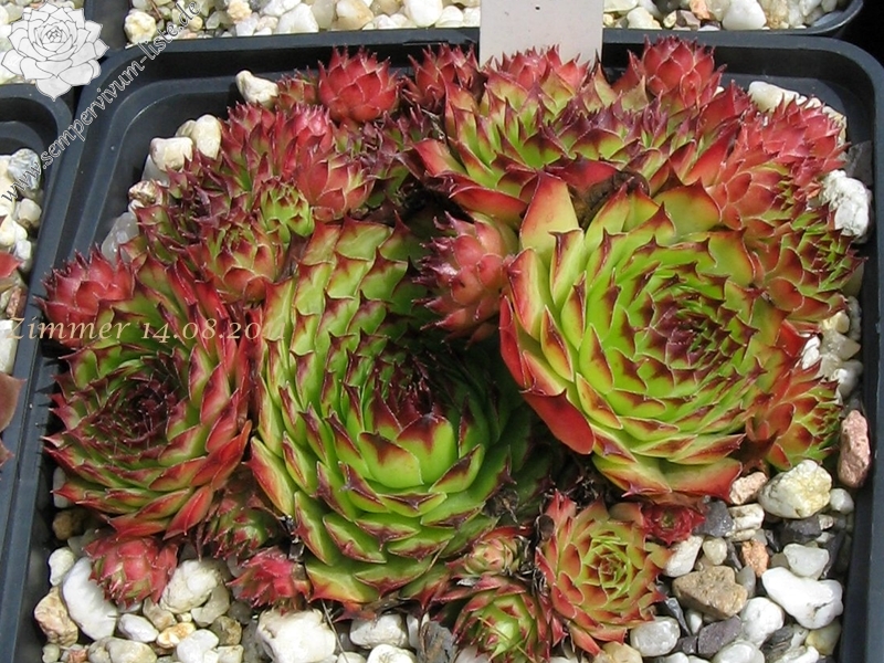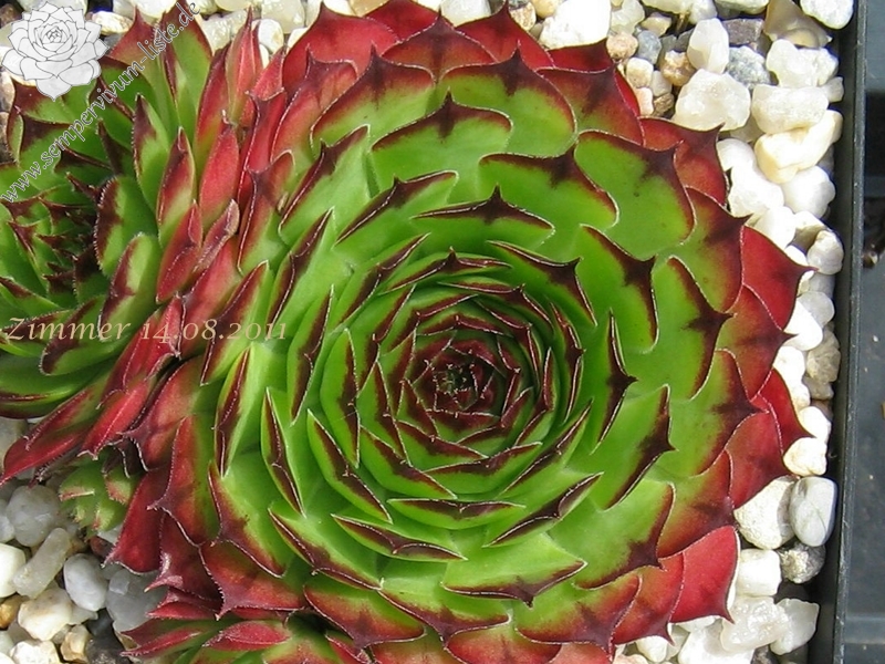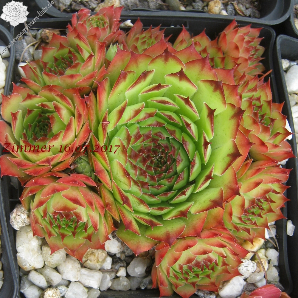 Rosettendurchmesser 5 cm, breit und flach, dunkelgrün, braunrote Spitzen.