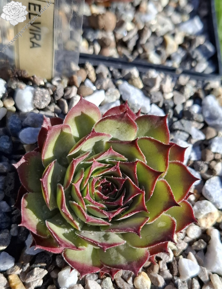 cv. Elvira hat große Rosetten bis zu 14 cm Durchmesser mit dunkelroter Farbe bei kaltem Wetter. cv.Elvira ist eine Selektion aus unserer Absaat.