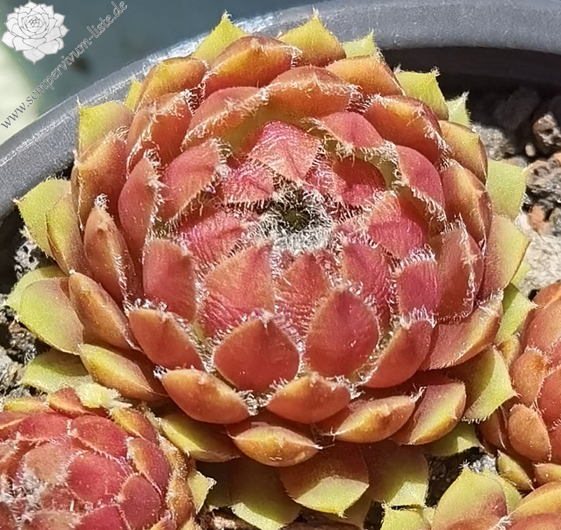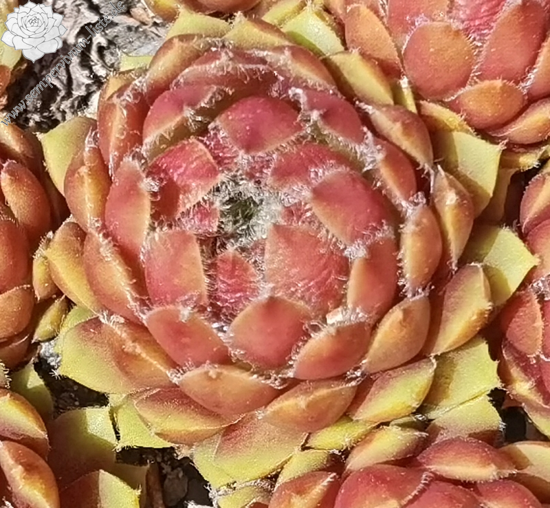 Die Rosetten sind ca. 5 cm groß, rot mit gelb-grünen äußeren Randblättern, die Blattränder und Spitzen schön bewimpert. Die Wimpern stehen etwas kreuz und quer, was mir aber besonders gut gefällt. Das geschlossene Herz der Rosetten ist weiß übersponnen, die Blätter selbst sind sukkulent, mit kleinen weißen Wunderkerzen bestückt. Im Winter vergrünen sie.