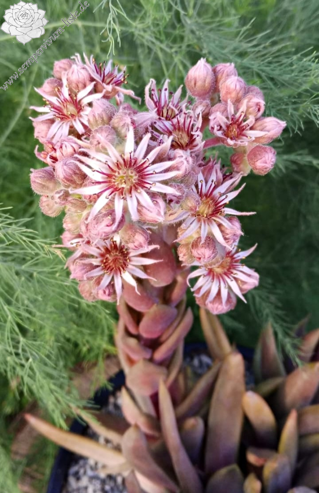 Eine zufällige Mutation von Silver Song mit einem erstaunlich sukkulenten Charakter. Rosetten mit länglichen Blättern, die mehr an Echeveria als an Sempervivum erinnern. Die Färbung ist identisch mit der des Elternteils, aber der rosa-lila Ton auf der Innenseite des Blattes ist intensiver. Reife Rosetten sind leicht „zottelig“ und brechen die richtige Form.