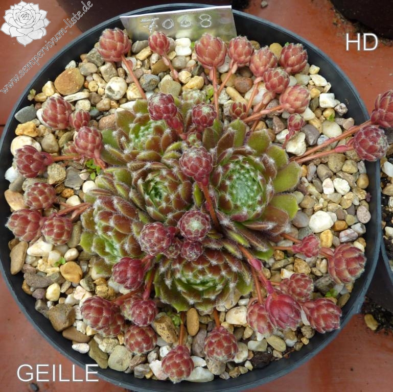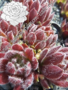 Sempervivum 'Geille' ist eine wüchsige Kreuzung. Die mittelgroßen, rötlichen Rosetten besitzen eine starke Behaarung. Die dichten Polster sind auch im Sommer schön gefärbt.