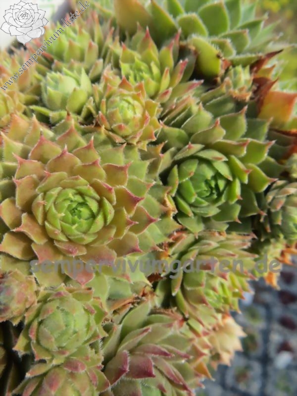 Sempervivum cv. Gerbeun ist eine mittelgroße, wüchsige Züchtung, die ich in einer niederländischen Gärtnerei gefunden habe. Sie hat mir sofort gefallen und ist noch ganz selten in den Sammlungen vertreten. Die Abbildung zeigt die Sommerfärbung! Im Frühjahr bleibt das hellgrüne Zentrum erhalten und die äußeren Blätter verfärben sich bräunlich. Sehr schön!
