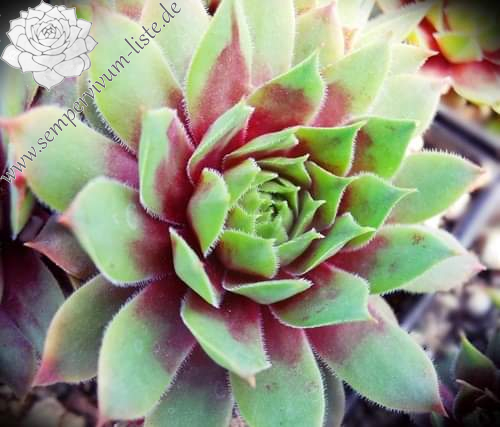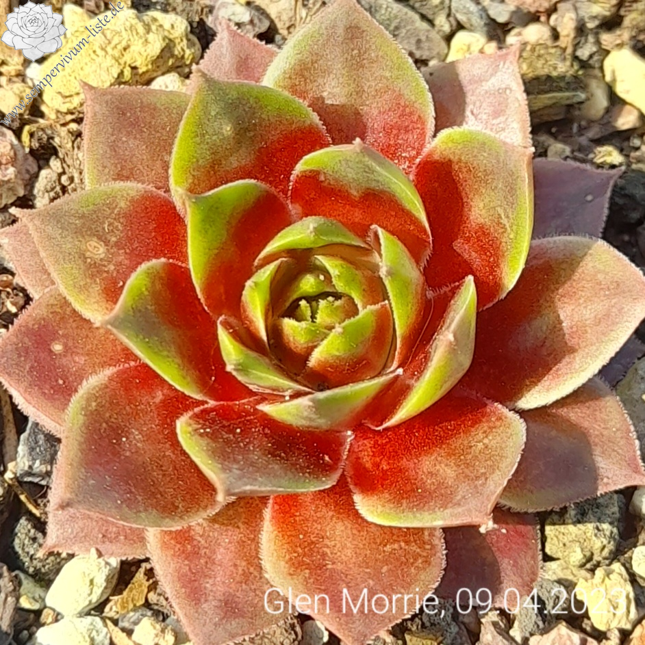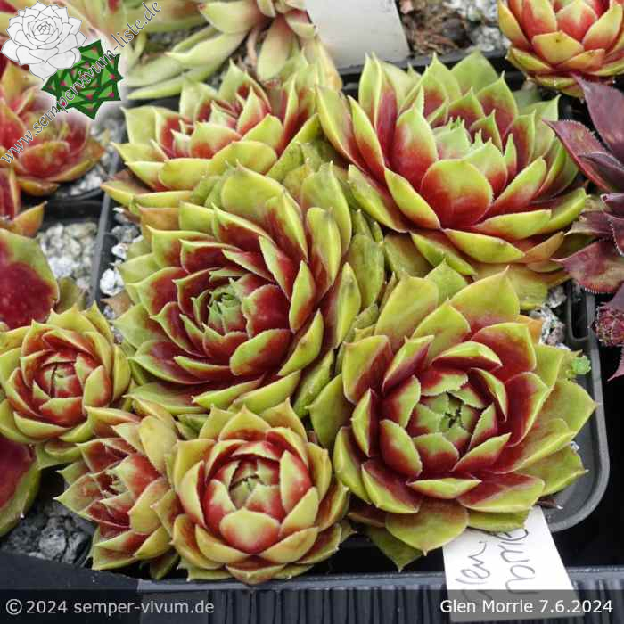 Eine attraktive Sorte aus den USA mit einmaliger Wuchsform. Die orangeroten Rosetten von mittlerer Größe zeigen je nach Jahreszeit hellgrüne bis gelbliche Spitzen. Sie formen ein lockeres Polster.