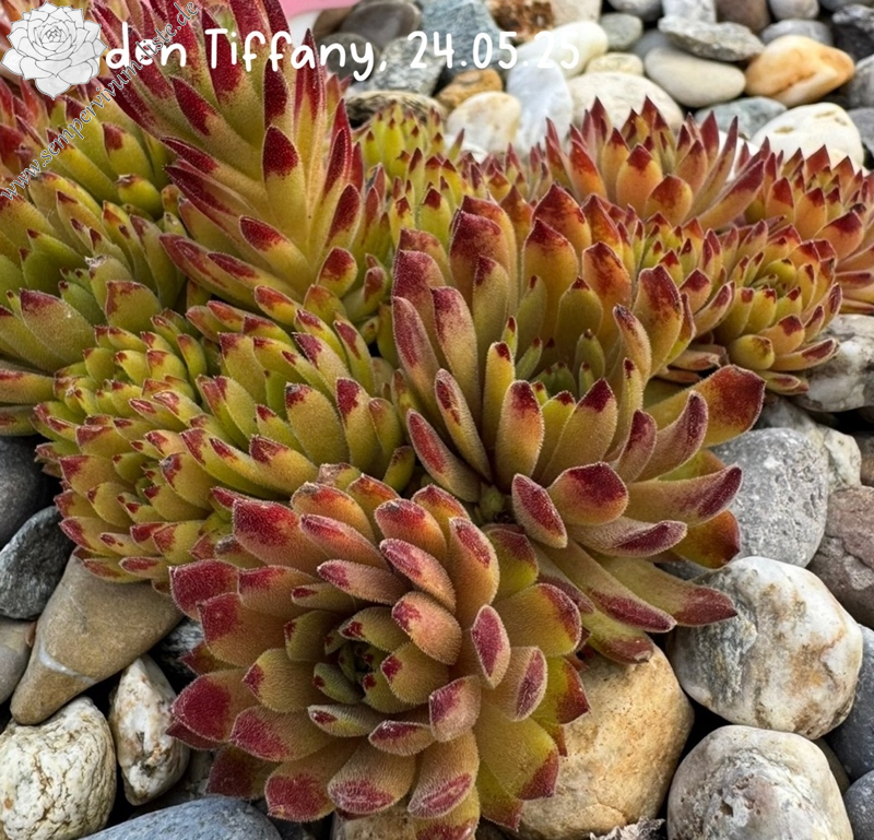 'Golden Tiffany' ist eine plüschige Sorte, wie die Mutter. Im Frühjahr sind die Rosetten hellgrün bis gelblich, die Blattspitzen tragen kleine rote Punkte. Im Mai haben sie die schönste Färbung, die Blätter werden goldgelb. Die Blattspitzen sind dunkelrot und das obere Drittel der Blätter ist rot gesprenkelt. Die Rosetten werden in der Sommerhitze immer heller, fast gelb und im Herbst vergrünen sie. Sie ist nicht so wüchsig wie ihre Geschwistersämlinge und ist auch etwas kleiner, insgesamt zarter. Aber trotz allem hat sie die Hitze gut überstanden.