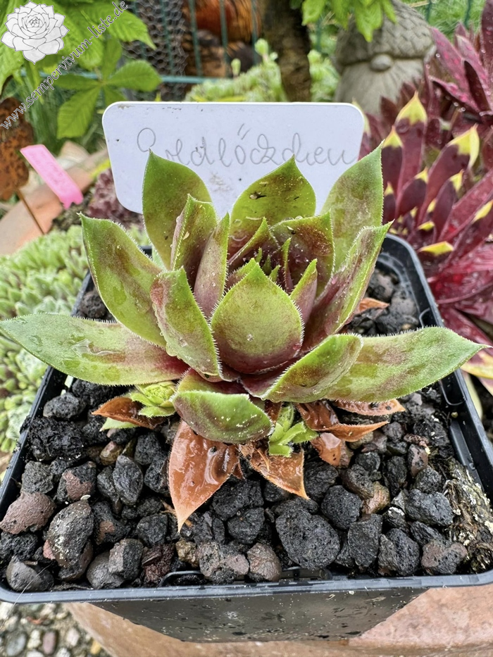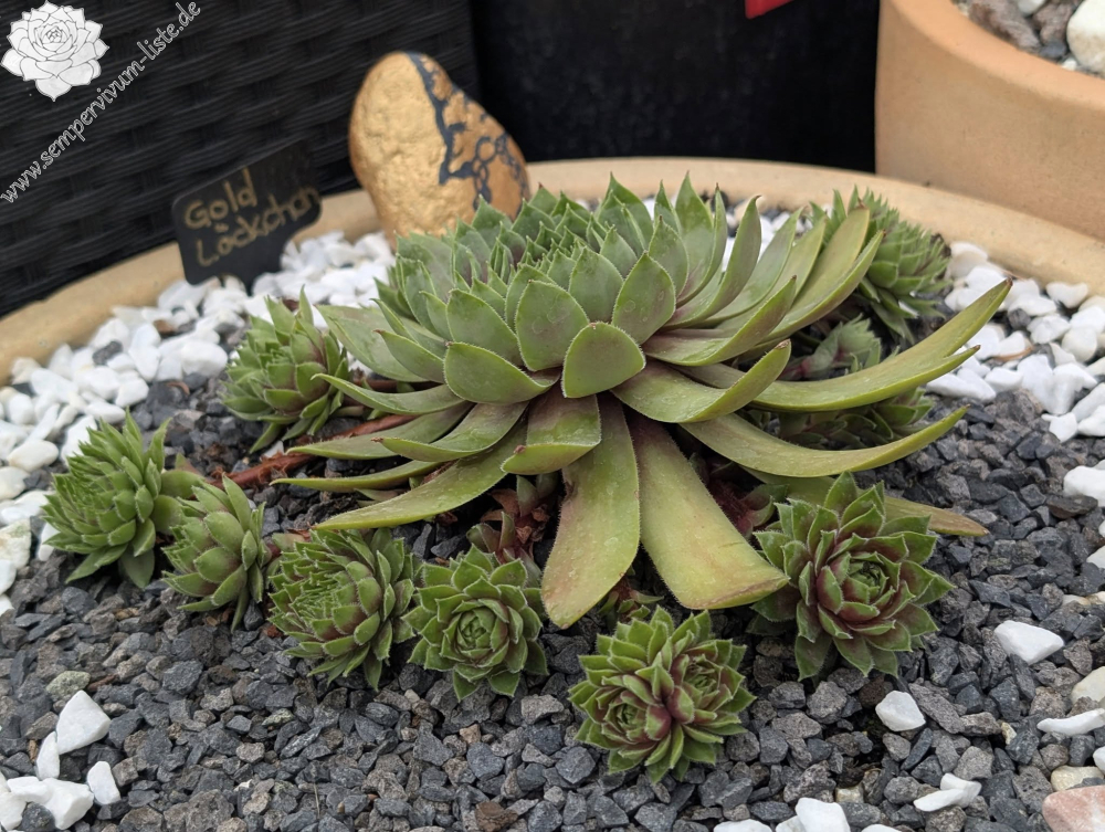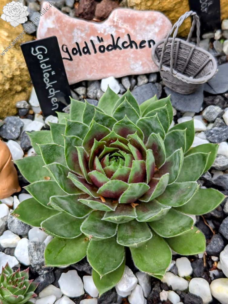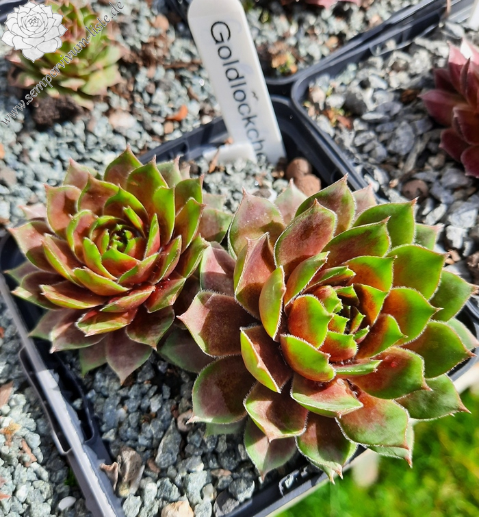 Im Frühjahr sind die langen spitzen Blätter kardinalrot mit gelbgrünen Spitzen. Die Blattränder haben die gleiche Farbe wie die Spitzen. Die Spitzen im Herz sind fein gezeichnet und werden mit jedem Blattkranz größer, bis sie in den äußersten Blattreihen dann zu 2/3 gelbgrün sind. Ab Mai werden die Farben kräftiger. Im Juni strahlt Goldlöckchen von der Mitte her in einem leuchtendem Grün, übergehend in Goldgelb und Orange. Ab August verblasst sie dann und wird hellgrün. 'Goldlöckchen' kindelt sehr gut an ca. 6-8cm langen roten Stolonen. Goldlöckchen bring Doppelköpfe, Dreifachköpfe und auch 'Goldlöckchen Cristate'.