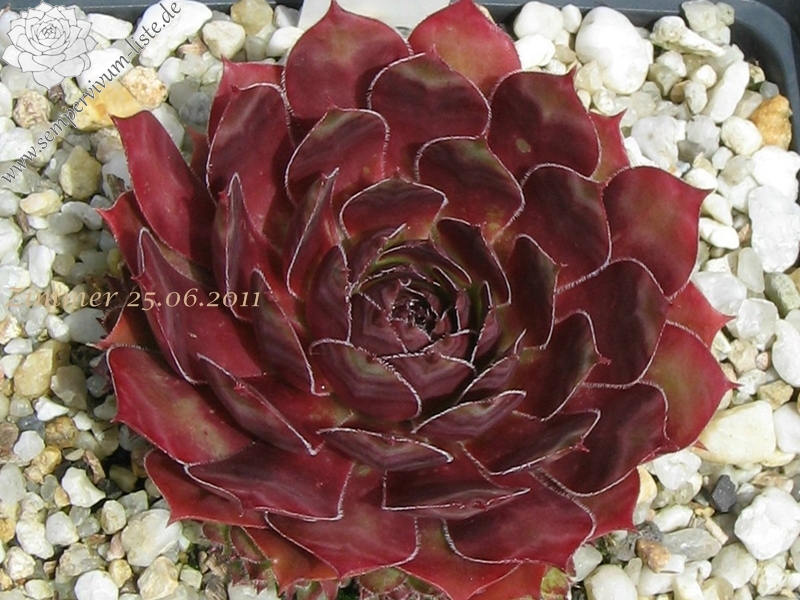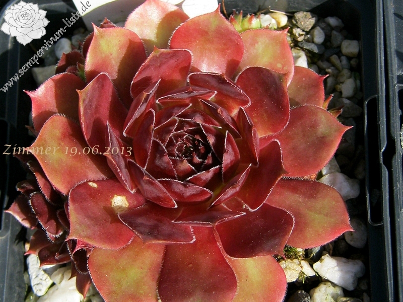 Hellgrüne Rosetten, mit breiten Blättern und breiten rotlila Blattenden. Dichte, kräftige Polster!