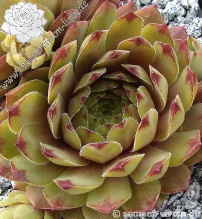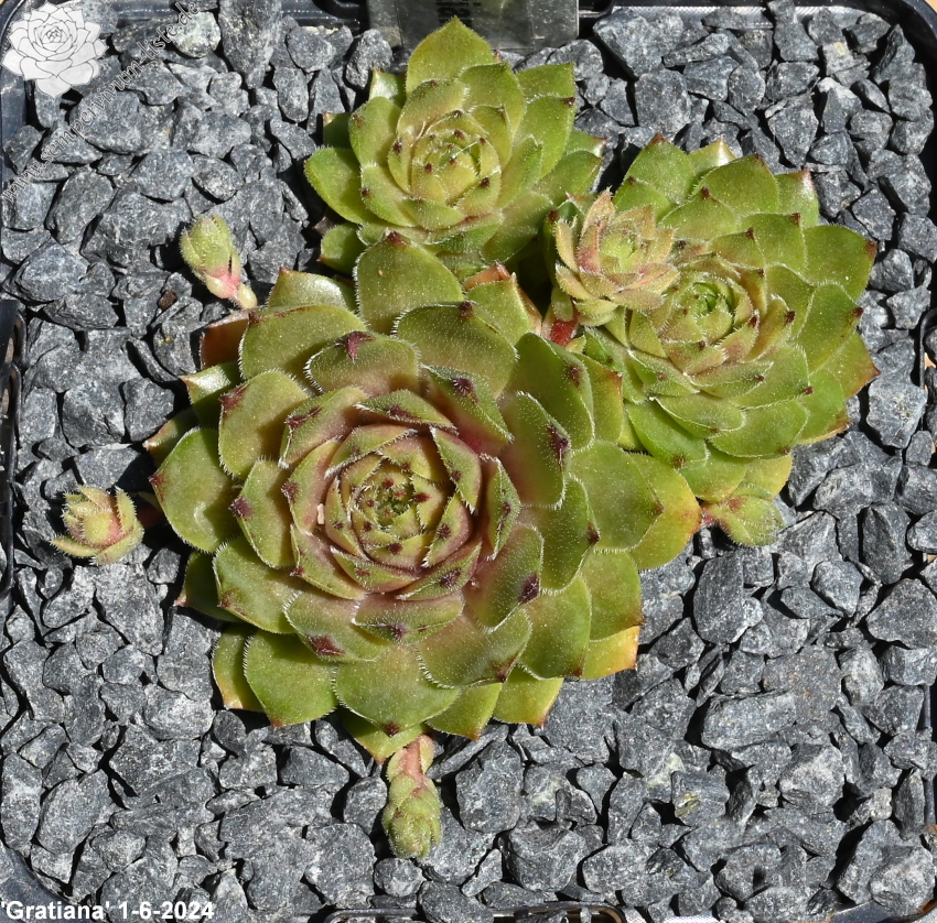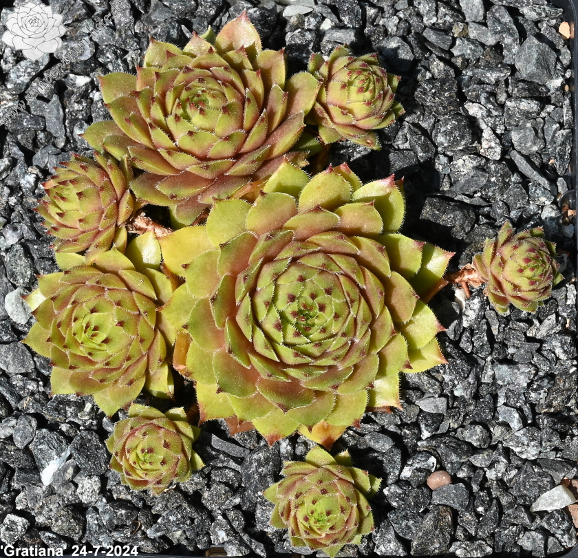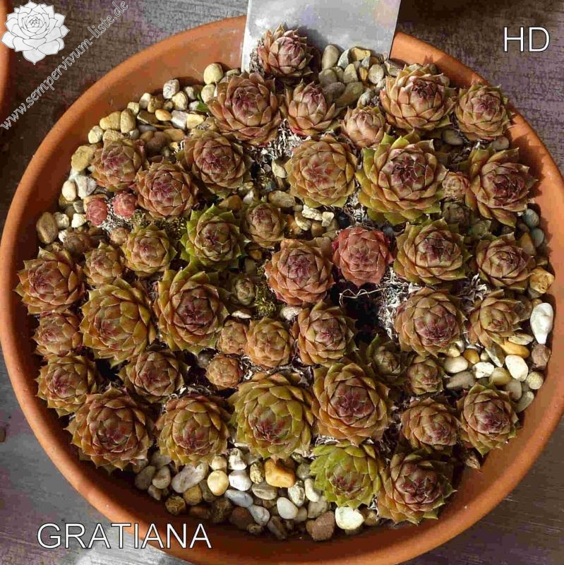 'Gratiana' formt sehr symmetrische Rosetten in olivgrünem bis ockerfarbenem Couleur. Die Blattspitzen sind purpurn abgezeichnet. Die Sorte stammt aus Belgien und ist bislang nahezu unbekannt.