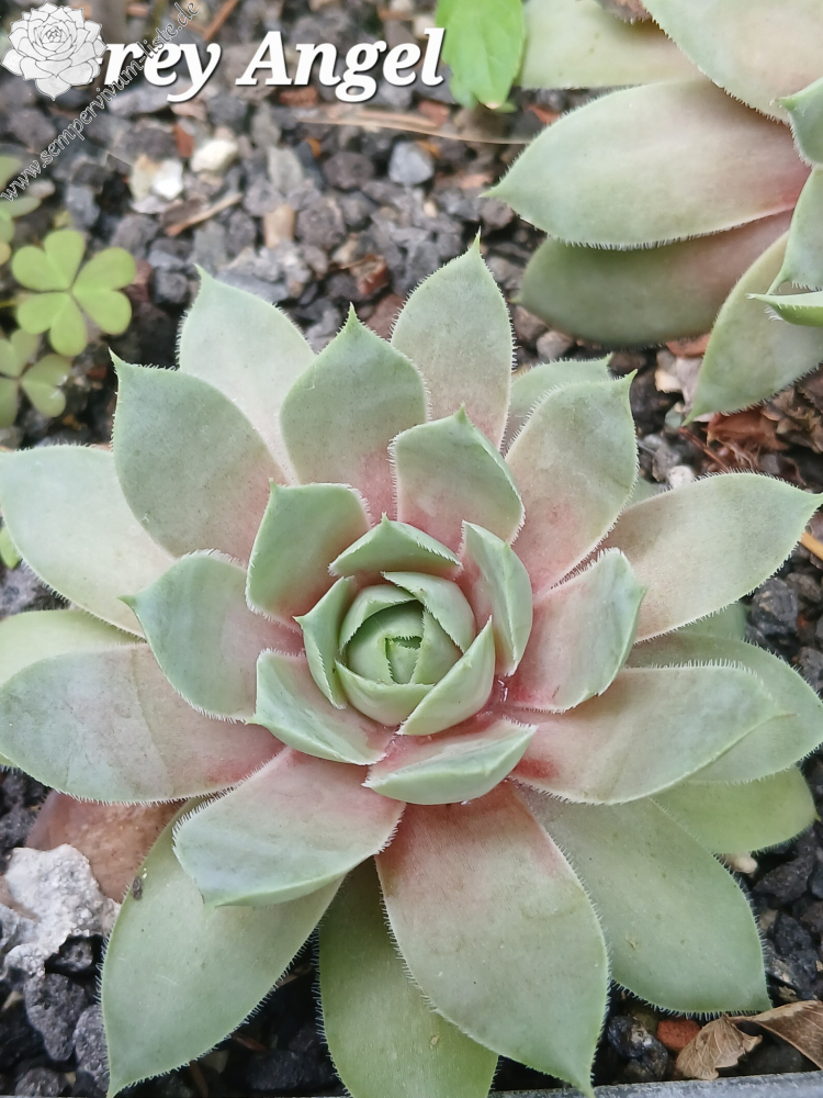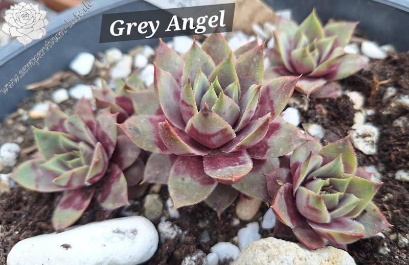 Mit Sempervivum 'Grey Angel' haben wir einen ganz neuen Hauswurz im Sortiment, der eine auffallend neue Farbe zeigt. Es handelt sich um einen Sämling von 'Leopold', mit den gleichen guten Eigenschaften. Die Rosetten erreichen einen Durchmesser von über 10 cm und sprossen willig. 'Grey Angel' ist wüchsig und bildet dichte Polster. Besonders gut gefällt mir der helle Farbton, die breiten Blätter und die kräftigen Rosetten. Die Färbung hält sich lange und verträgt auch höhere Temperaturen. Das leicht rosa gefärbte Zentrum fällt sofort ins Auge und hebt sich deutlich ab. Die Pflanzen besitzen einen ganz eigenen Reiz und begeistern jeden Sommer aufs Neue. Einer meiner neuen Favoriten! Die Blüten werden gerne von Insekten besucht.