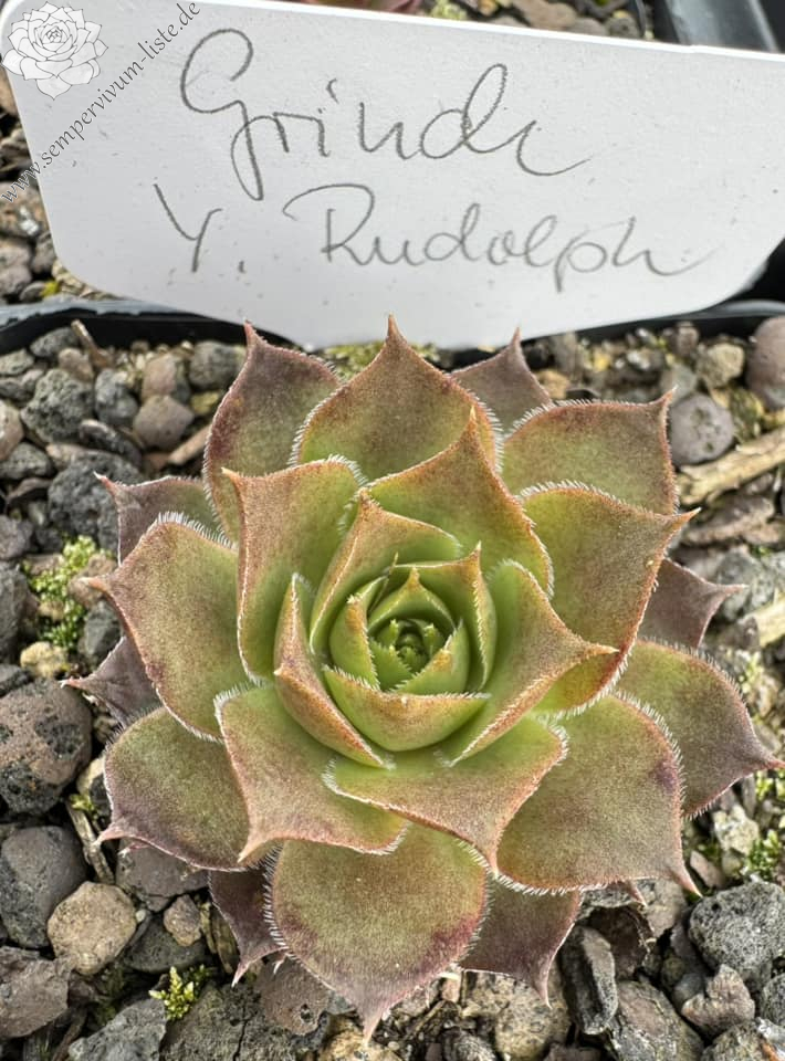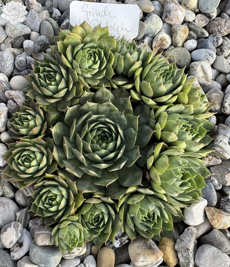 'Grinch' ist ebenfalls ein Sämling aus der Selbstaussaat von 'Sky Rockoon'. Die Rosetten haben eine mittlere Größe und zeigen das ganze Jahr über warme Grüntöne. Im Frühjahr sind die Blattspitzen auffällig kurzzeitig rot eingefärbt, im Sommer verschwindet diese Färbung wieder komplett und es zeigen sich wieder deutlich die abgesetzten smaragdgrünen Spitzen. Sie ist außerordentlich stabil und offenbart keinerlei Anfälligkeit bei jeglichem Wetter. Eine normal wüchsige Pflanze, die eine schöne Ausstrahlung besitzt.