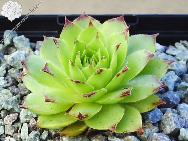 Frischgrüne Rosetten, die besonders im Frühjahr kräftig rote Blattenden zeigt. Diese tolle, ältere Züchtung bildet leider nur wenig Nachkommen!