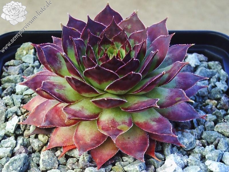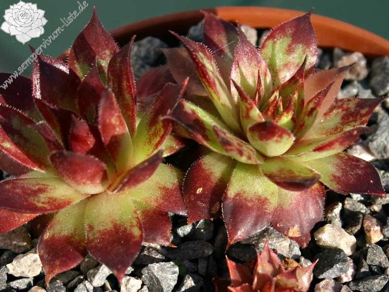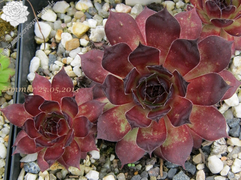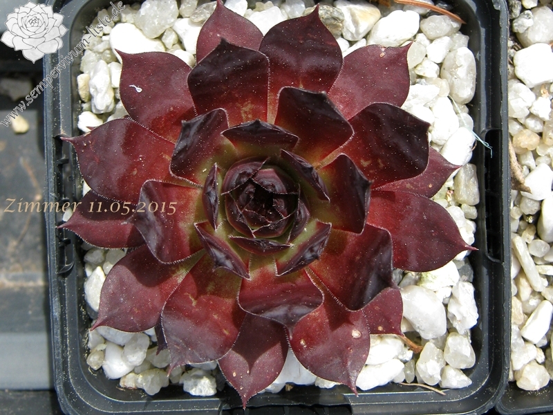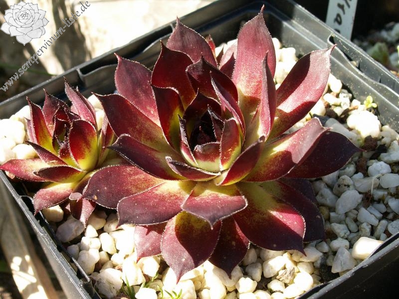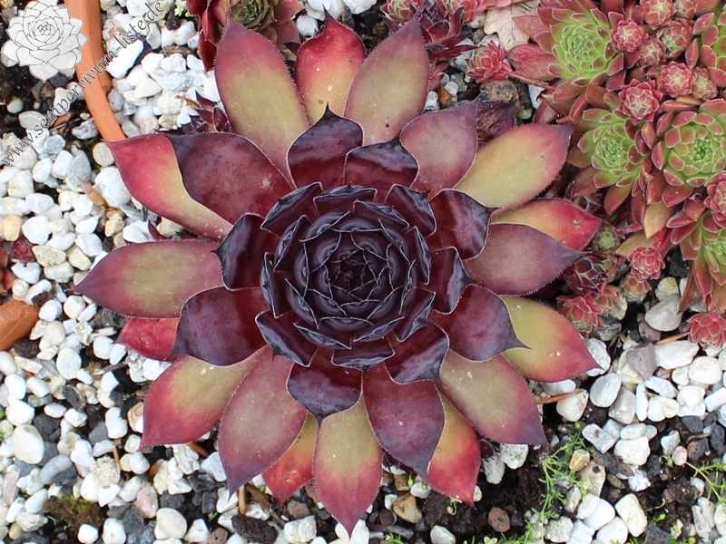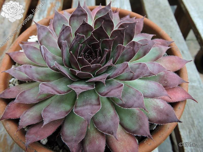 Zweifarbige, große Tectorumform mit umgekehrter Farbgebung. Außen grün, und nach innen hin ein dunkel marmoriertes Lila. Ab Herbst erleben wir eine genau umgekehrte Winterfärbung. Die Mutterpflanze 'Eisbär' hat sich nicht durchgesetzt, sondern der Vater 'Ford´s Shadow'. Das Auffallende an ihr sind zweimal im Jahr die Farbübergänge. In dieser Zeit kann man sie als sehr schön gefleckt bezeichnen.