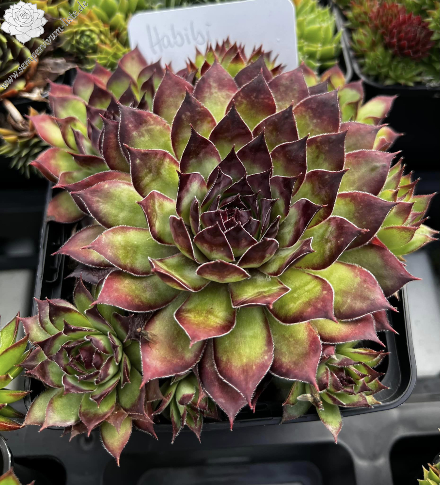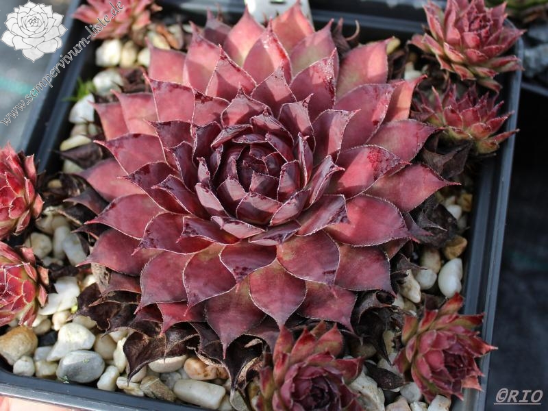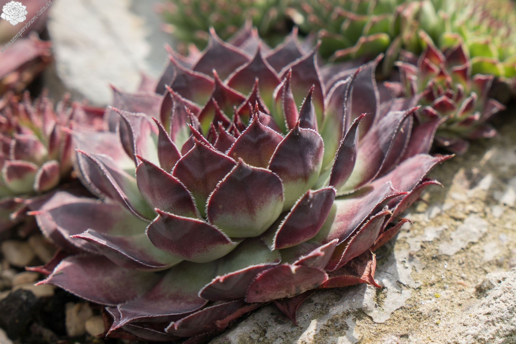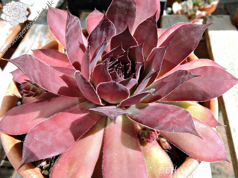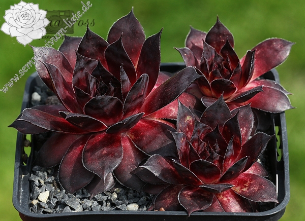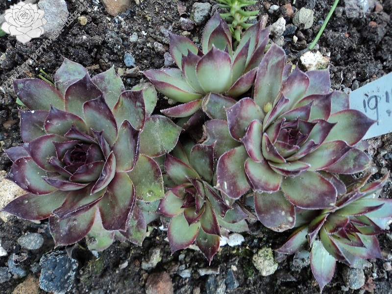 Zweifarbige, große Tectorumform mit umgekehrter Farbgebung. Außen grün, und nach innen hin ein dunkel marmoriertes Lila. Ab Herbst erleben wir eine genau umgekehrte Winterfärbung. Die Mutterpflanze 'Eisbär' hat sich nicht durchgesetzt, sondern der Vater 'Ford´s Shadow'. Das Auffallende an ihr sind zweimal im Jahr die Farbübergänge. In dieser Zeit kann man sie als sehr schön gefleckt bezeichnen.