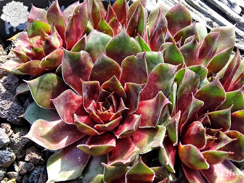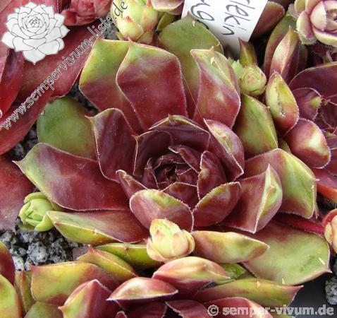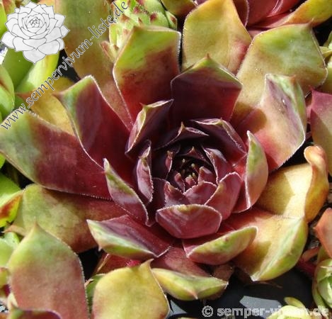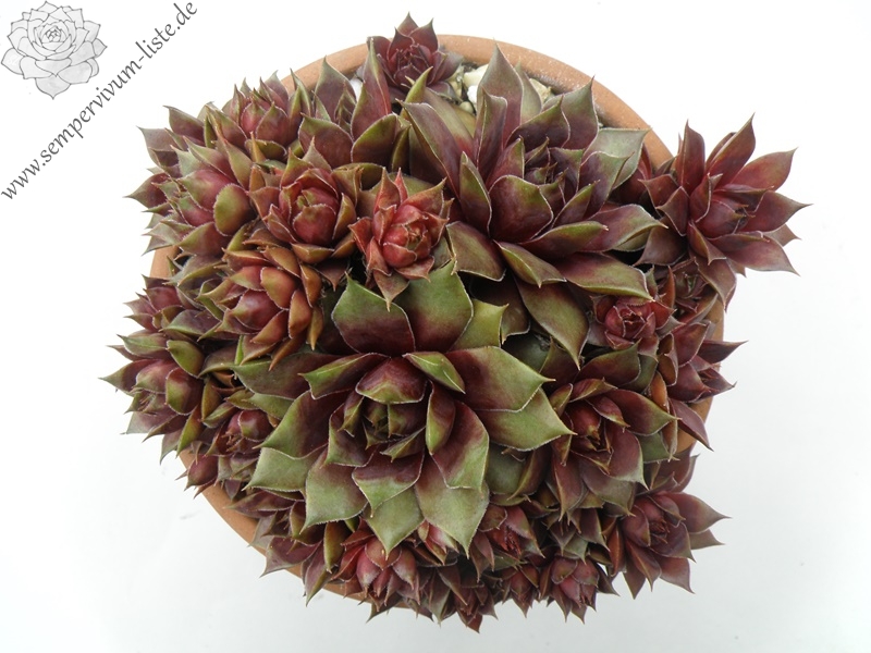 Eine unbekannte Hybride aus den USA: Mittelgroße bis größere Rosetten mit weinroten Blättern die breit abgezeichnete olivgrüne Spitzen besitzen.
