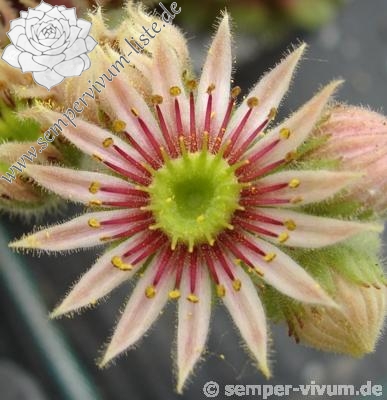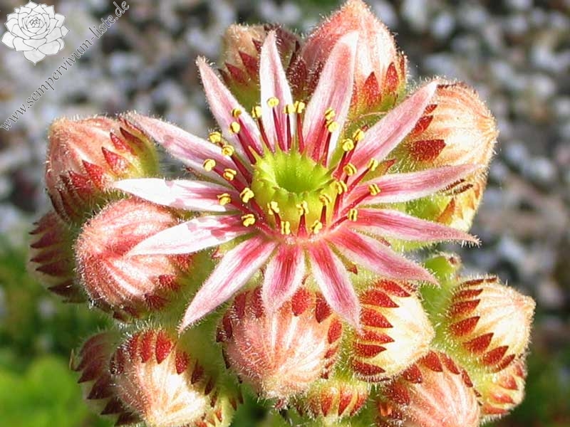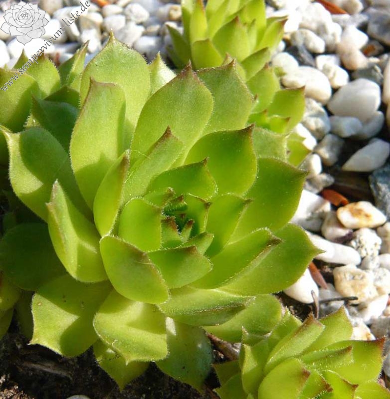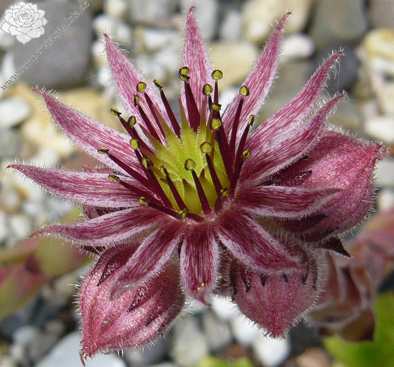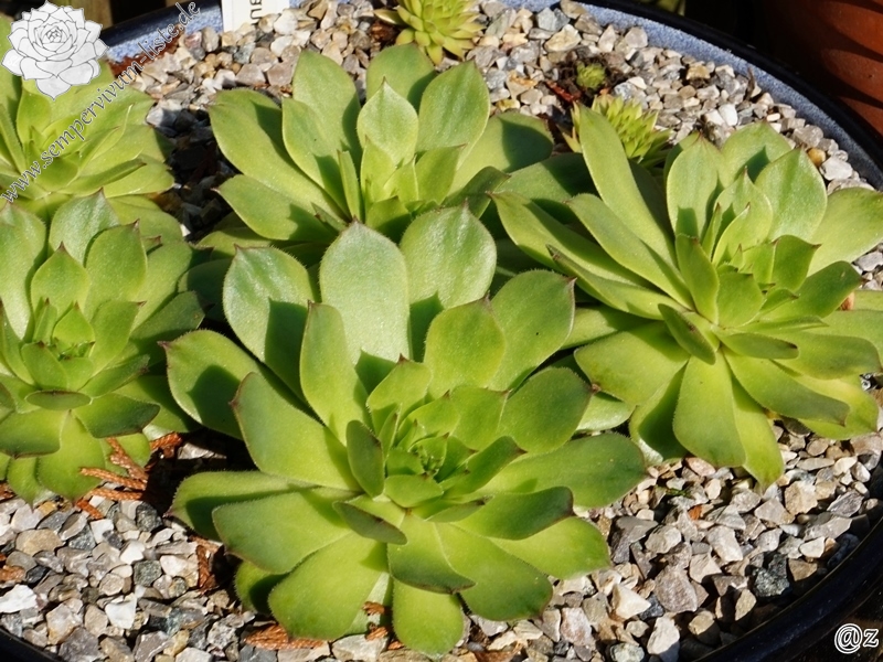 Erwin Geiger: Eine Naturhybride aus S. grandiflorum x S. tectorum mit frischgrünen, fein behaarten Rosetten, die im Aostatal in Italien gefunden wurde. Im Sommer verfärben sich die Blätter bei vollsonnigem Standort gelblichgrün.