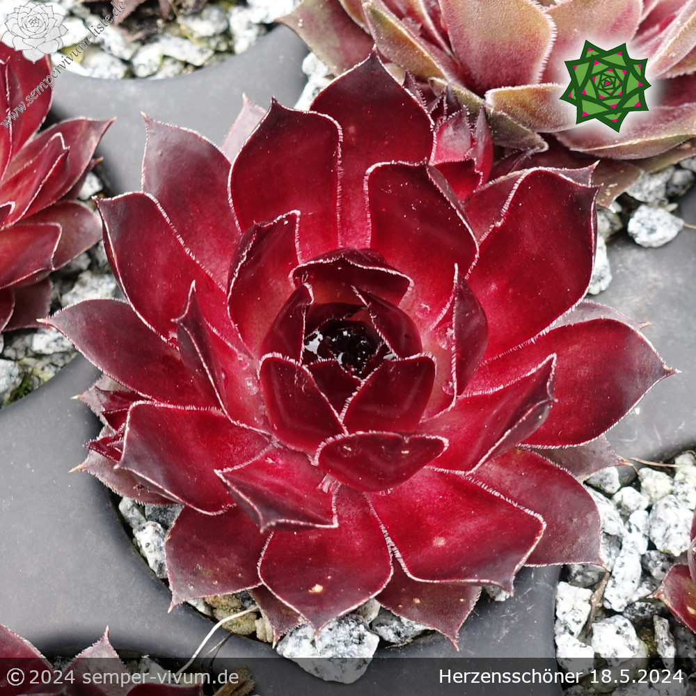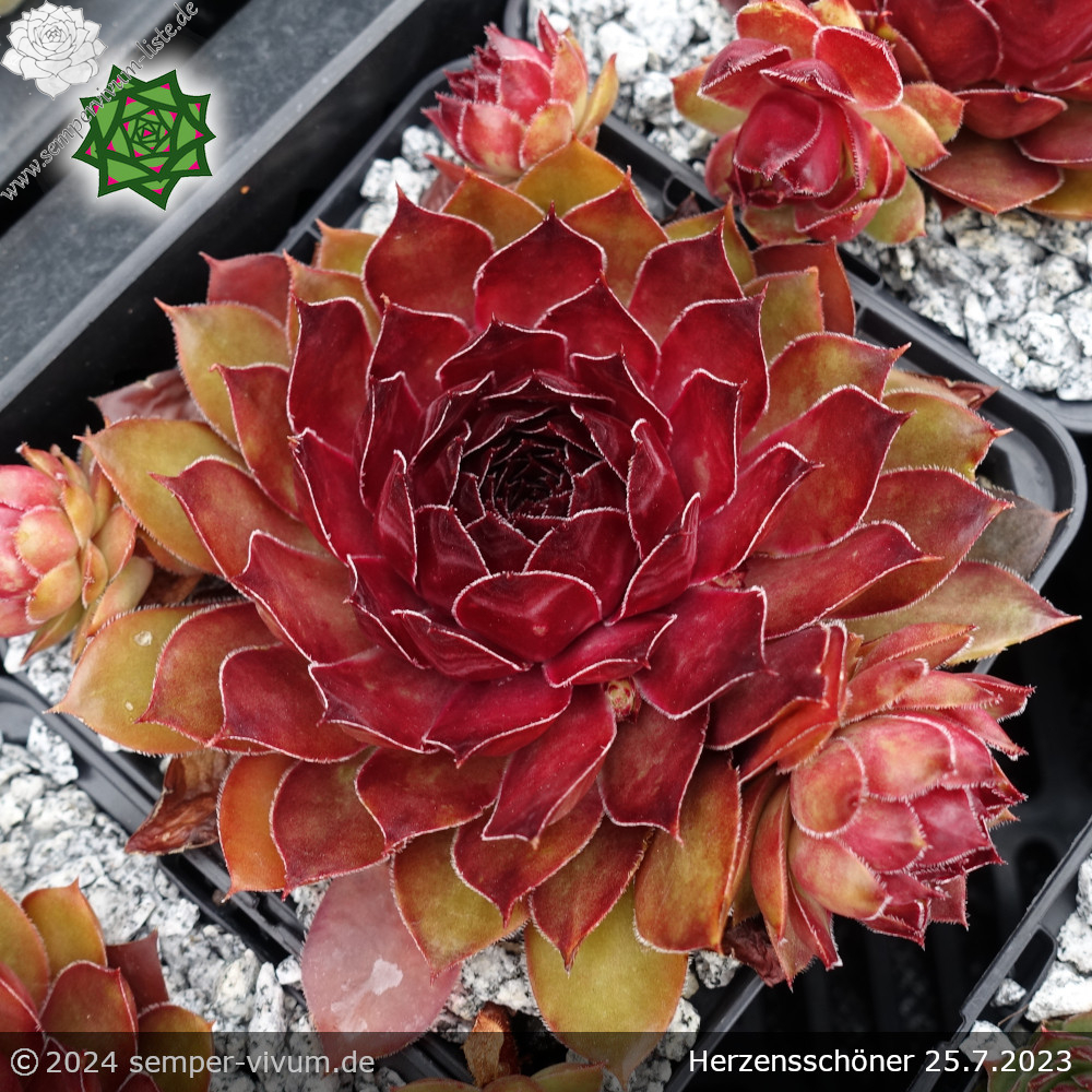 Es ist ein Sämling und zugleich eine Verbesserung der belgischen Sorte 'Aalrika': Die Rosetten haben große Ähnlichkeit in Form und Farbe. Insgesamt ist unsere Neuheit jedoch wüchsiger, da die Muttersorte jedes Jahr recht wenig Nachwuchs formt. Allgemein verlieren viele rote Hauswurz Züchtungen während der heißen Monate ihre brillanten Rottöne. Davon ist 'Herzensschöner' ausgenommen, da sie auch zu dieser Jahreszeit durch die leuchtend rote Färbung ins Auge fällt.2025: Es ist ein Sämling der sehr gesuchten belgischen Rarität 'Aalrika', die kaum Nachwuchs hat. Die Rosetten haben große Ähnlichkeit in deren Größe, Form und Farbe. Erfreulicherweise ist unsere neue Auslese wüchsiger. Daher könnte man sie schon als eine Verbesserung der Muttersorte beschreiben. Allgemein verlieren viele rote Hauswurz Züchtungen während der heißen Monate ihre brillanten Rottöne. Jedoch fällt 'Herzensschöner' auch zu dieser Jahreszeit durch die leuchtend rote Färbung ins Auge, währenddessen sogar noch bronzefarbene Töne den Glamour verzaubern.